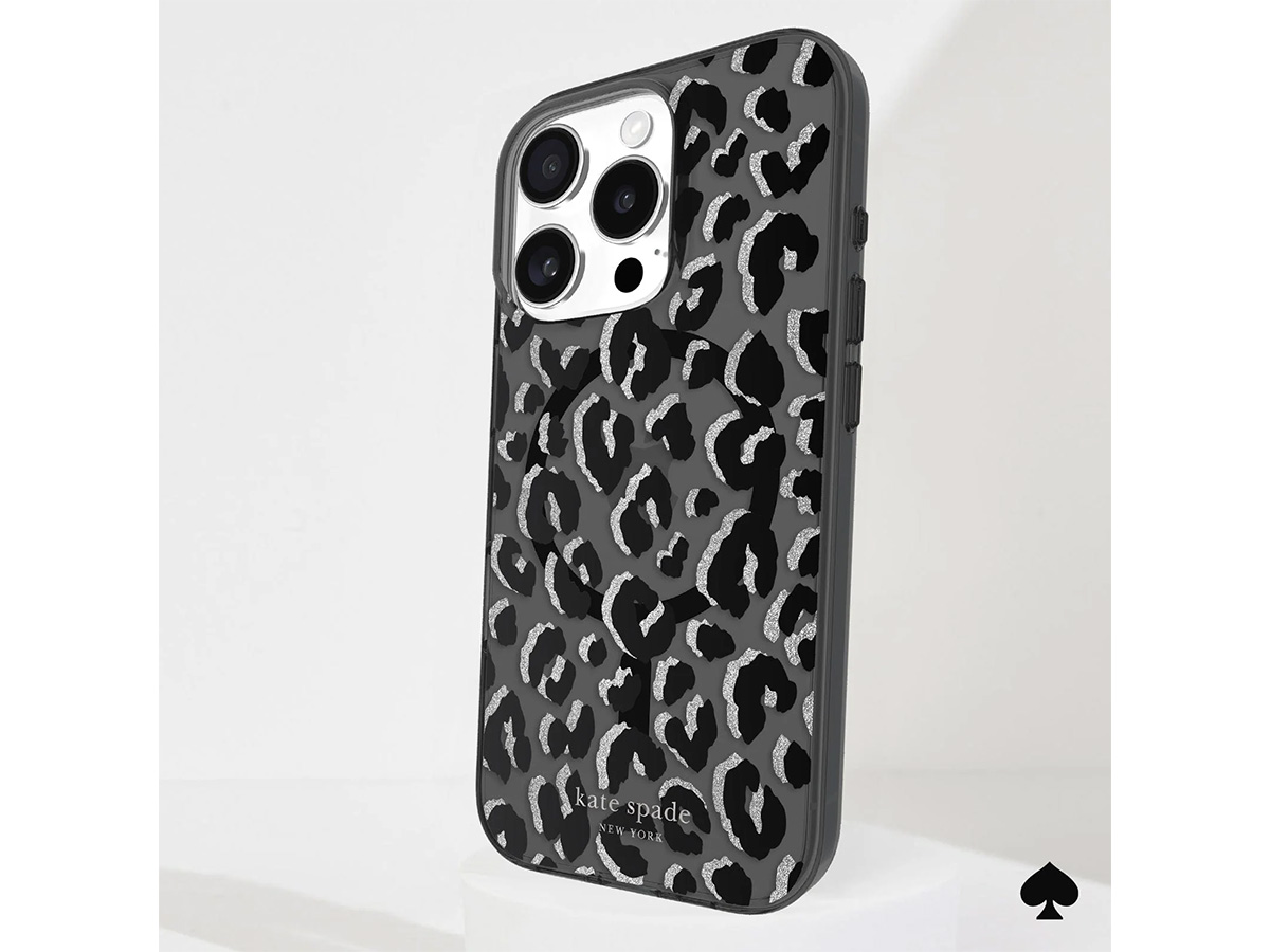 Dit originele Kate Spade New York iPhone hoesje werd speciaal ontworpen voor de iPhone 16 Pro. Het hoesje is uitgevoerd in een modieuze monochrome luipaard print met subtiele glinsterende zilveren detaillering.
