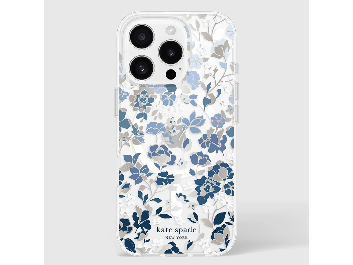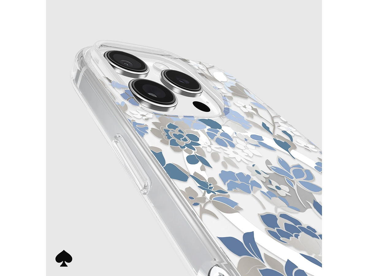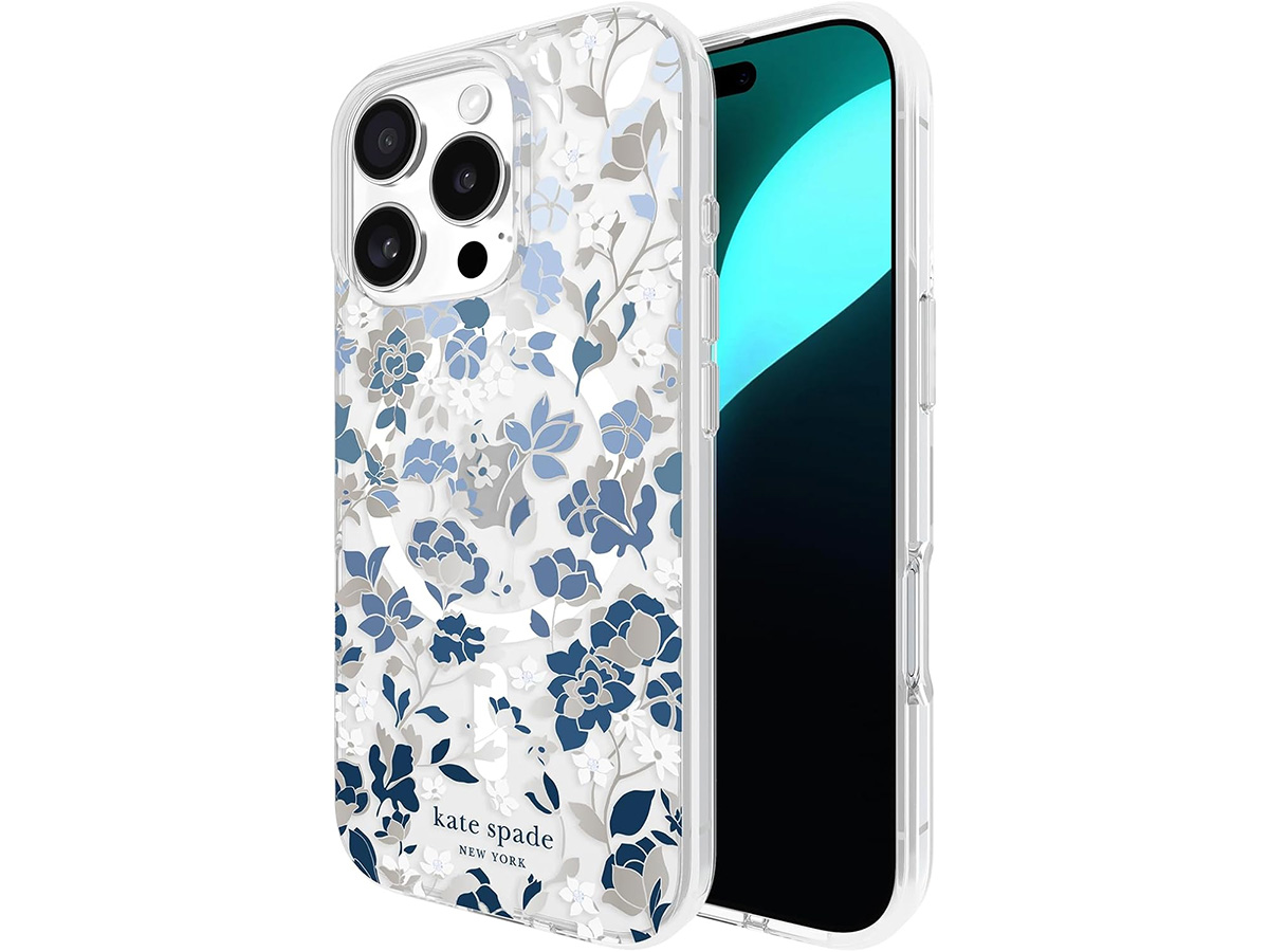 Dit originele Kate Spade New York iPhone hoesje werd speciaal ontworpen voor de iPhone 16 Pro. Het hoesje is in de basis doorzichtig en voorzien van een elegante bloemenprint met blauwe en glanzend zilverkleurige details die de case een zeer stijlvolle uitstraling geven.