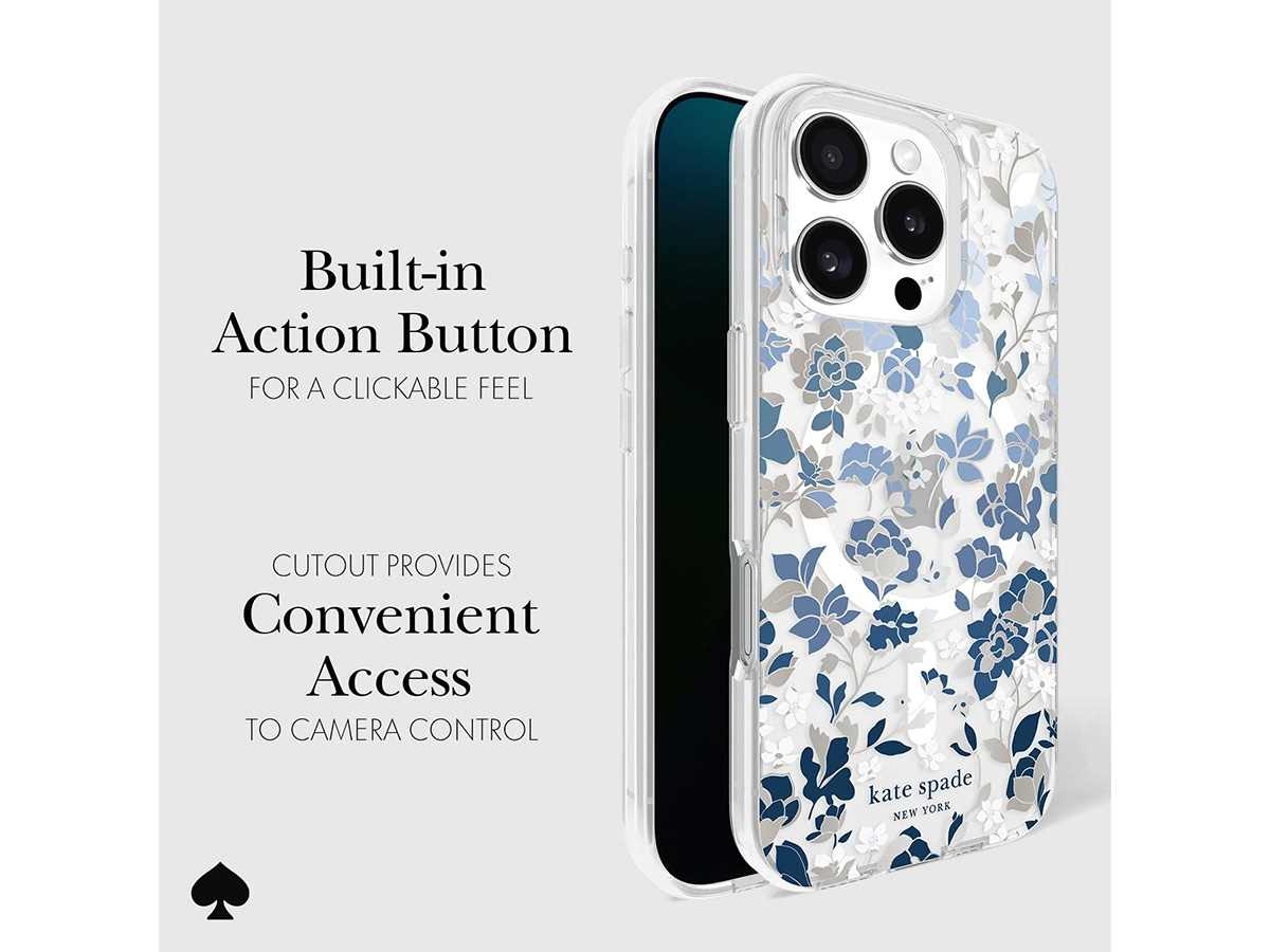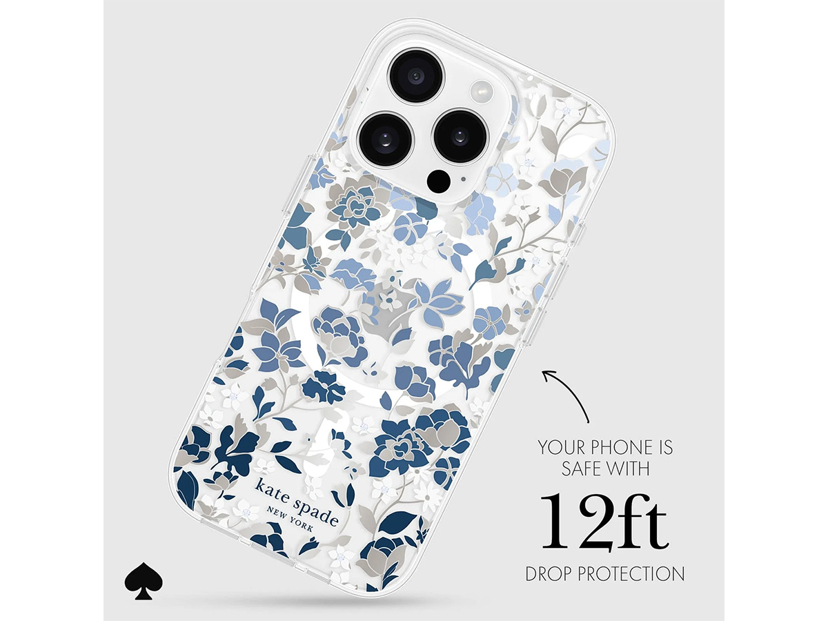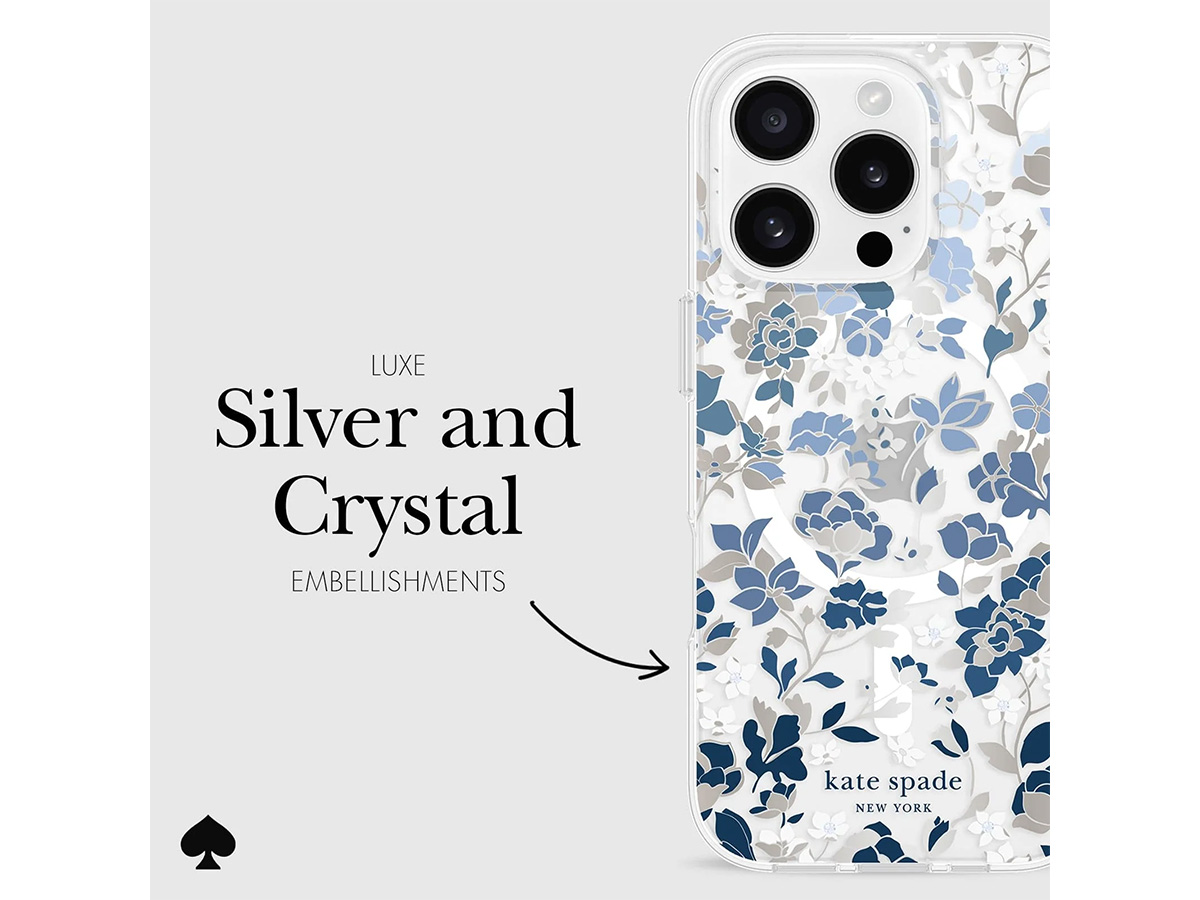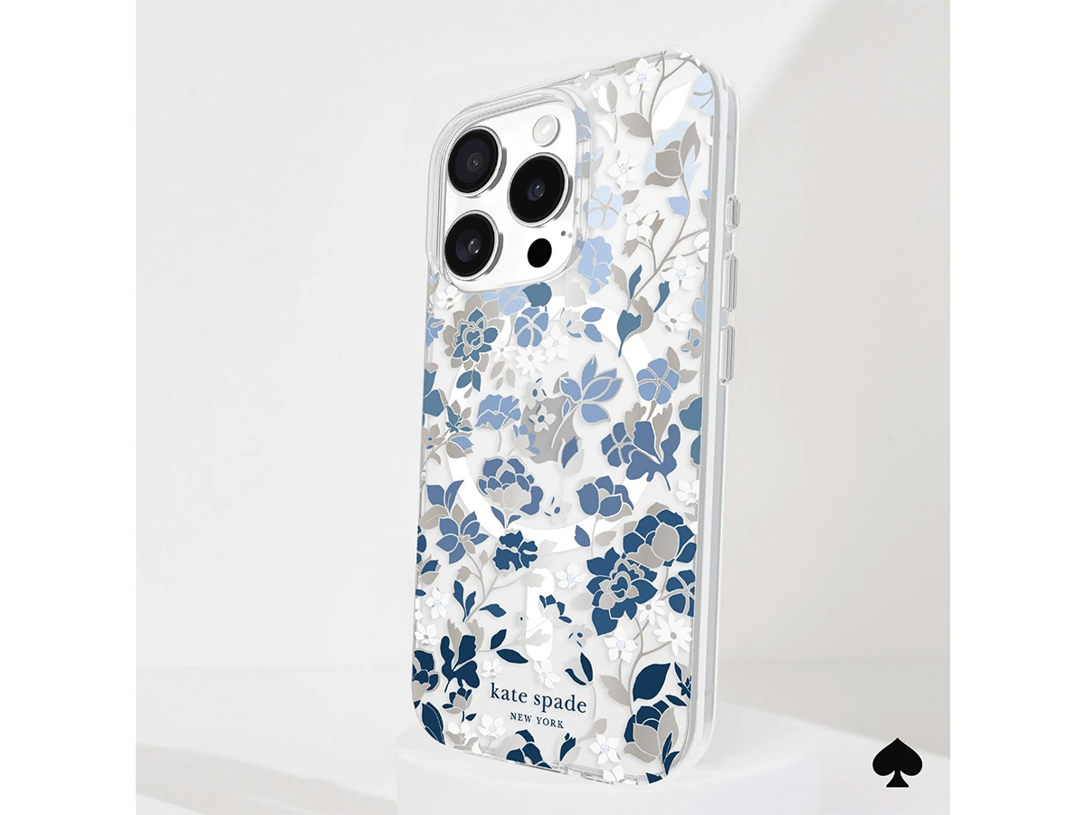 Dit originele Kate Spade New York iPhone hoesje werd speciaal ontworpen voor de iPhone 16 Pro. Het hoesje is in de basis doorzichtig en voorzien van een elegante bloemenprint met blauwe en glanzend zilverkleurige details die de case een zeer stijlvolle uitstraling geven.