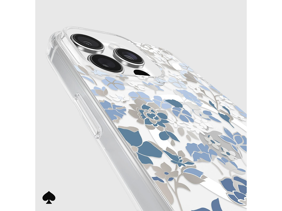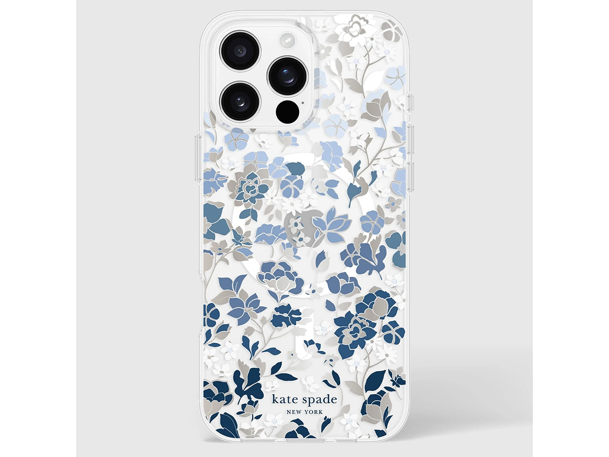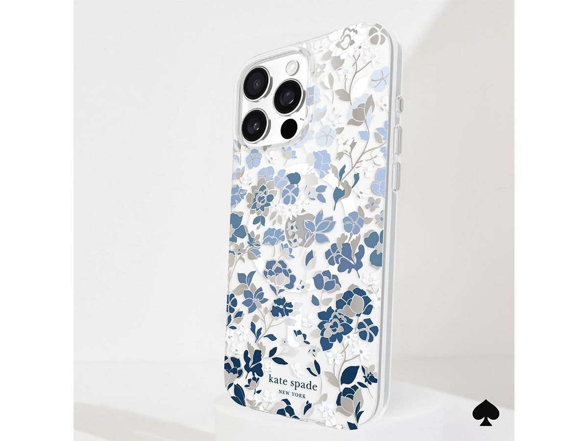 Dit originele Kate Spade New York iPhone hoesje werd speciaal ontworpen voor de iPhone 16 Pro Max. Het hoesje is in de basis doorzichtig en voorzien van een elegante bloemenprint met blauwe en glanzend zilverkleurige details die de case een zeer stijlvolle uitstraling geven.