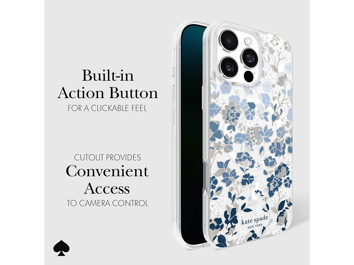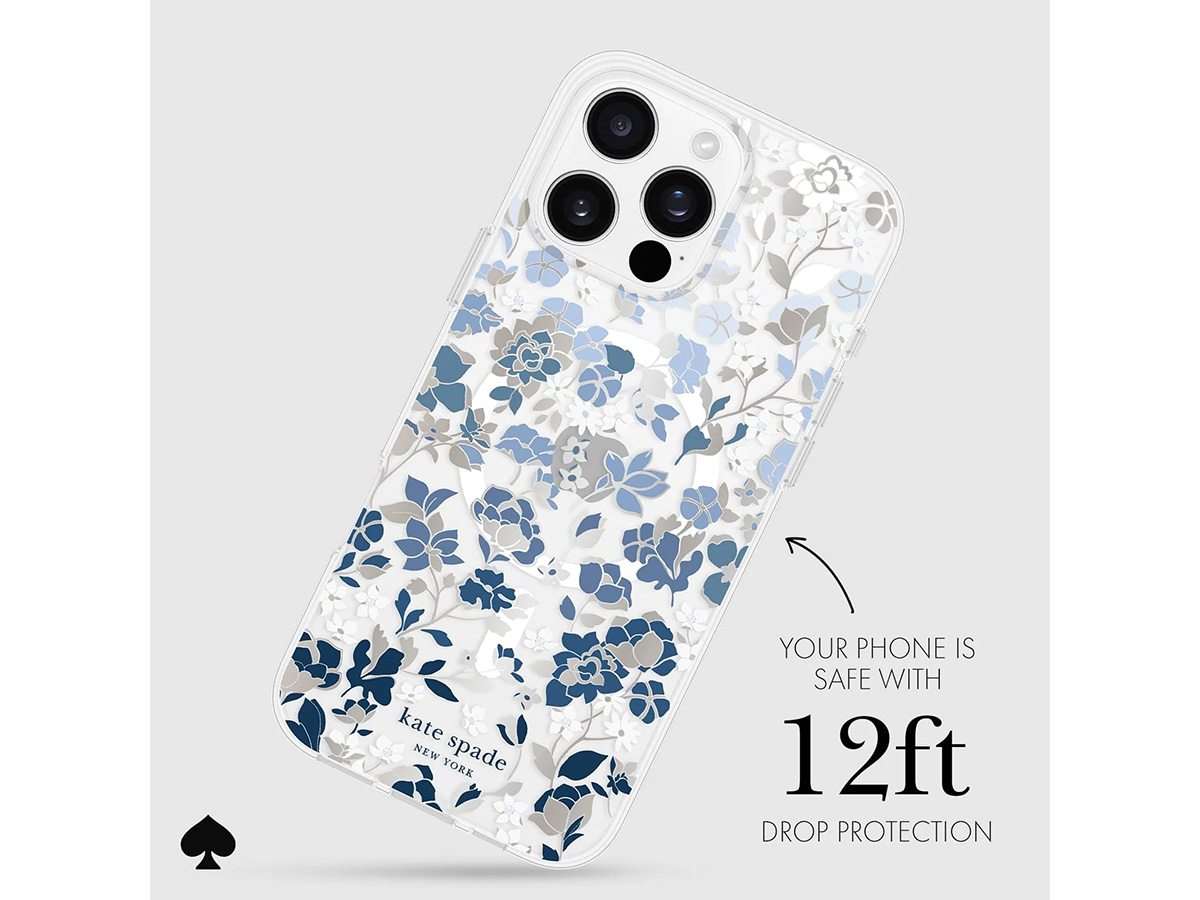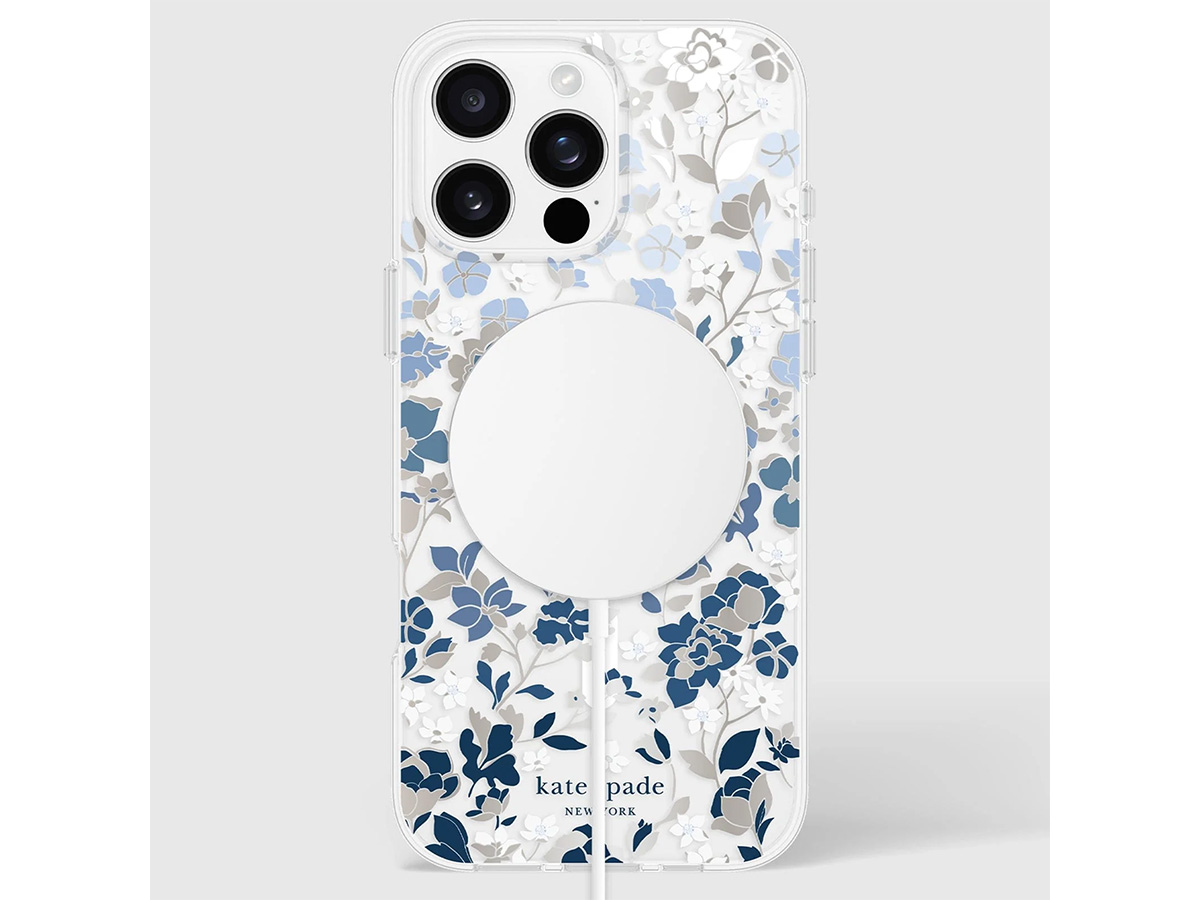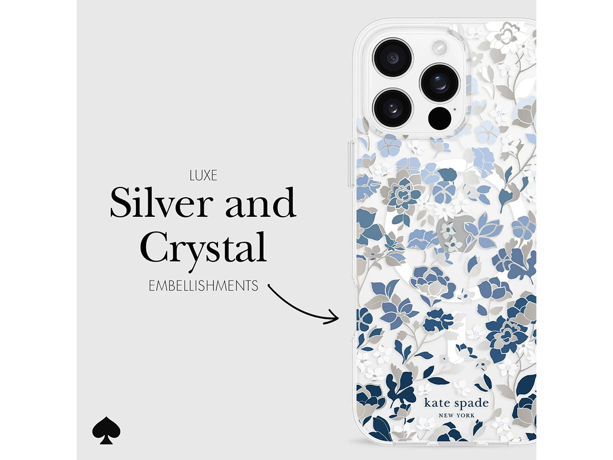 Dit originele Kate Spade New York iPhone hoesje werd speciaal ontworpen voor de iPhone 16 Pro Max. Het hoesje is in de basis doorzichtig en voorzien van een elegante bloemenprint met blauwe en glanzend zilverkleurige details die de case een zeer stijlvolle uitstraling geven.