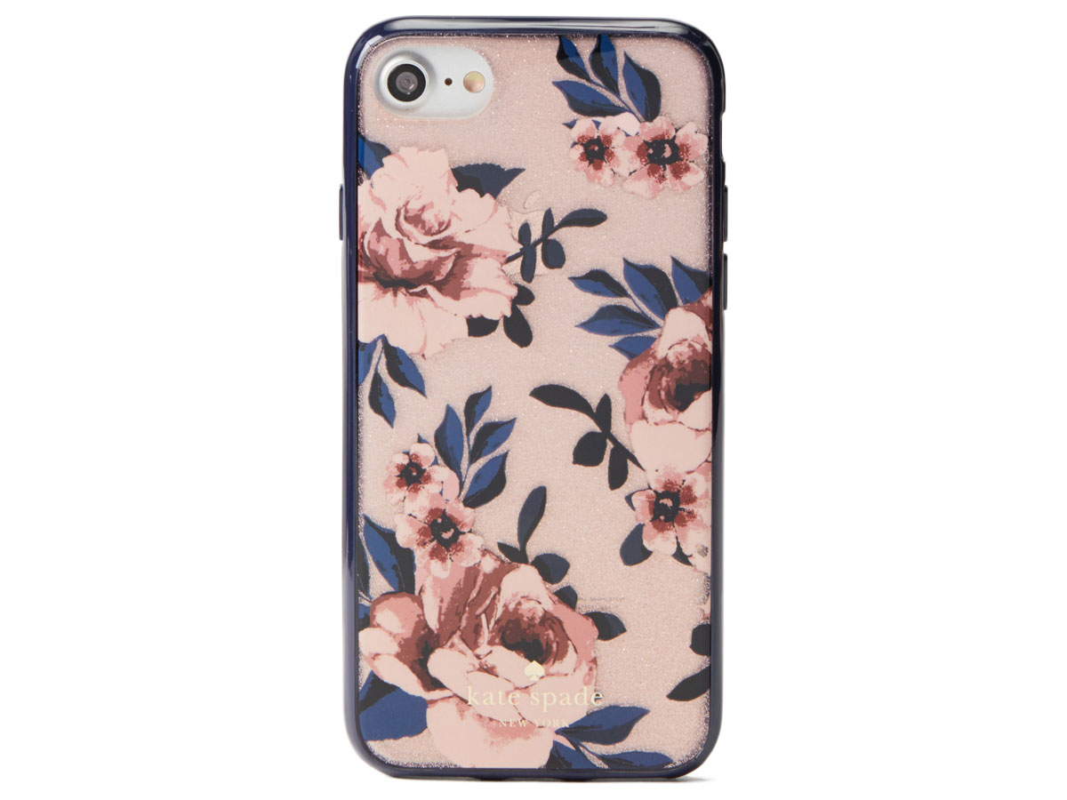 Deze originele Kate Spade Glitter Prairie Rose case voor iPhone 8, 7 en 6/6s is uitgevoerd in een prachtige bloemenprint. Deze heeft een rosé ondergrond met subtiele glitters erin, en een chique diep donkerblauwe rand.