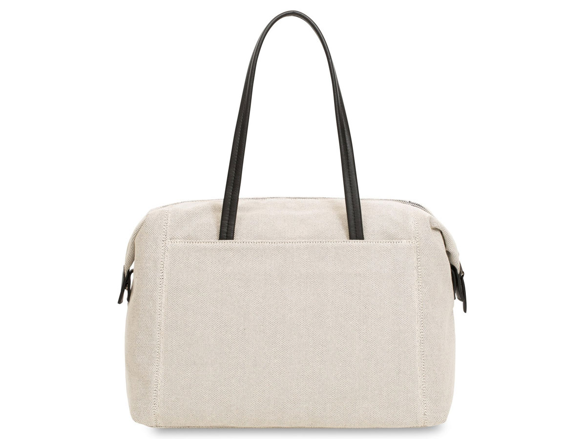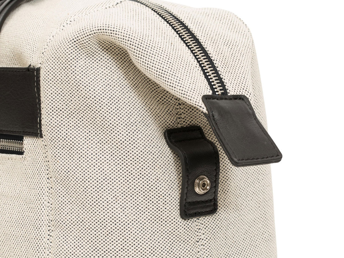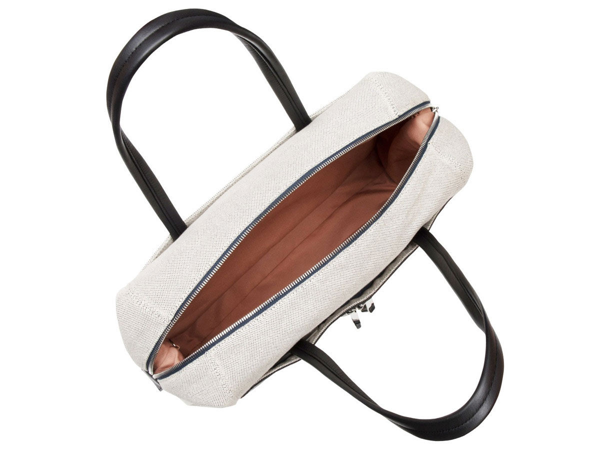 Deze elegante en zeer ruime Knomo Curzon laptoptas is gemaakt van sterk waterbestendig canvas in lichtgrijs, met zwart leren handvatten en afwerking en donkerblauwe details. De roze binnenvoering zorgt voor een zeer aantrekkelijke uitstraling.