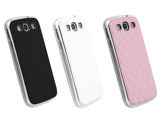 Deze fraaie cases zijn in de basis gemaakt van kunststof, met echt leer op de achterzijde. Dit leer is op fraaie wijze in ruitvorm gestikt. De zijkanten van de case zijn transparant gemaakt, waardoor de zilveren rand van de Galaxy S3 goed zichtbaar blijft wanneer de case om de Galaxy S3 zit. Een bijzonder fraaie manier om bescherming te bieden aan je Samsung Galaxy S3!