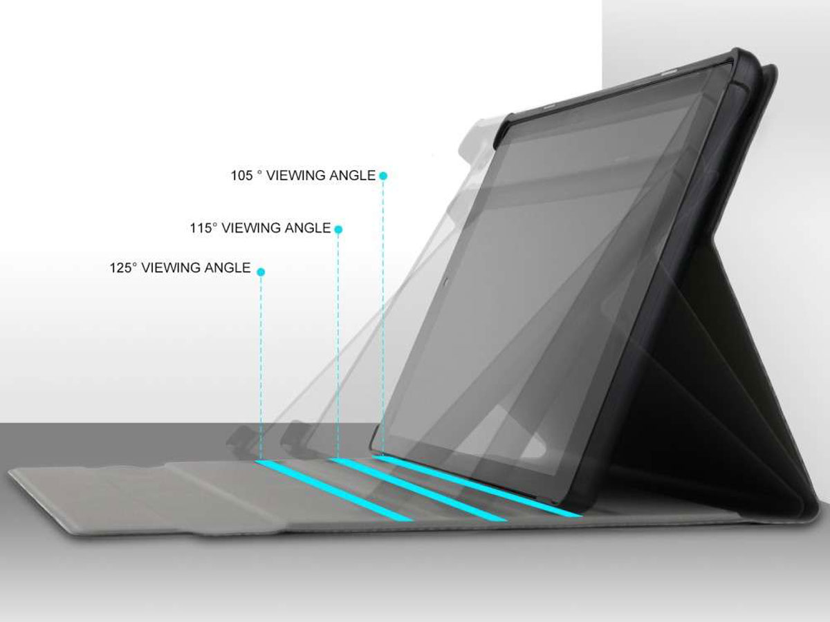 Los van het toetsenbord heeft deze Lenovo Tab E10 hoes ook genoeg in huis om een prettige metgezel te zijn. De case is exact op maat gemaakt, zodat de tablet er eenvoudig in vast klikt. Daarbij blijven alle toetsen, aansluitingen en de camera vrij. De hoes heeft een standaard functie waarbij uit verschillende kijkhoeken gekozen kan worden.