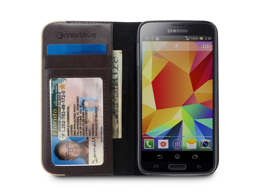 Het hoesje is speciaal voor de Samsung Galaxy S5 ontworpen, en past daardoor perfect. De Galaxy S5 klikt eenvoudig in het hoesje vast, waarbij zowel alle toetsen, aansluitingen als de camera vrij blijven. Binnenin het hoesje is ook uitgebreide bergruimte voor pasjes en (papier)geld.