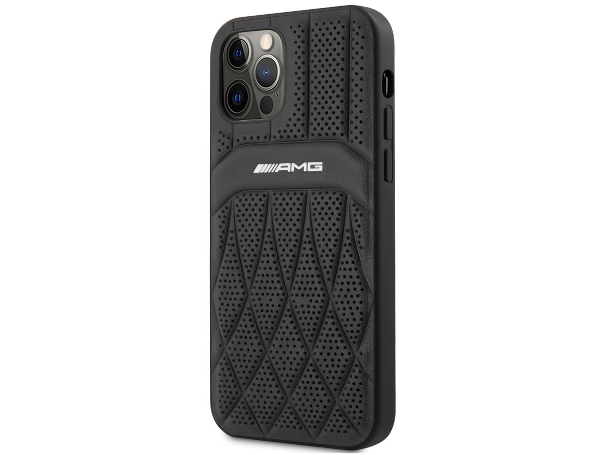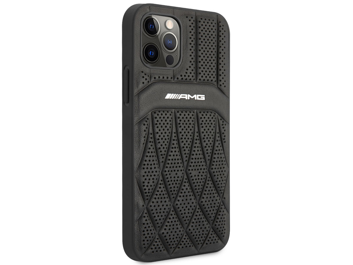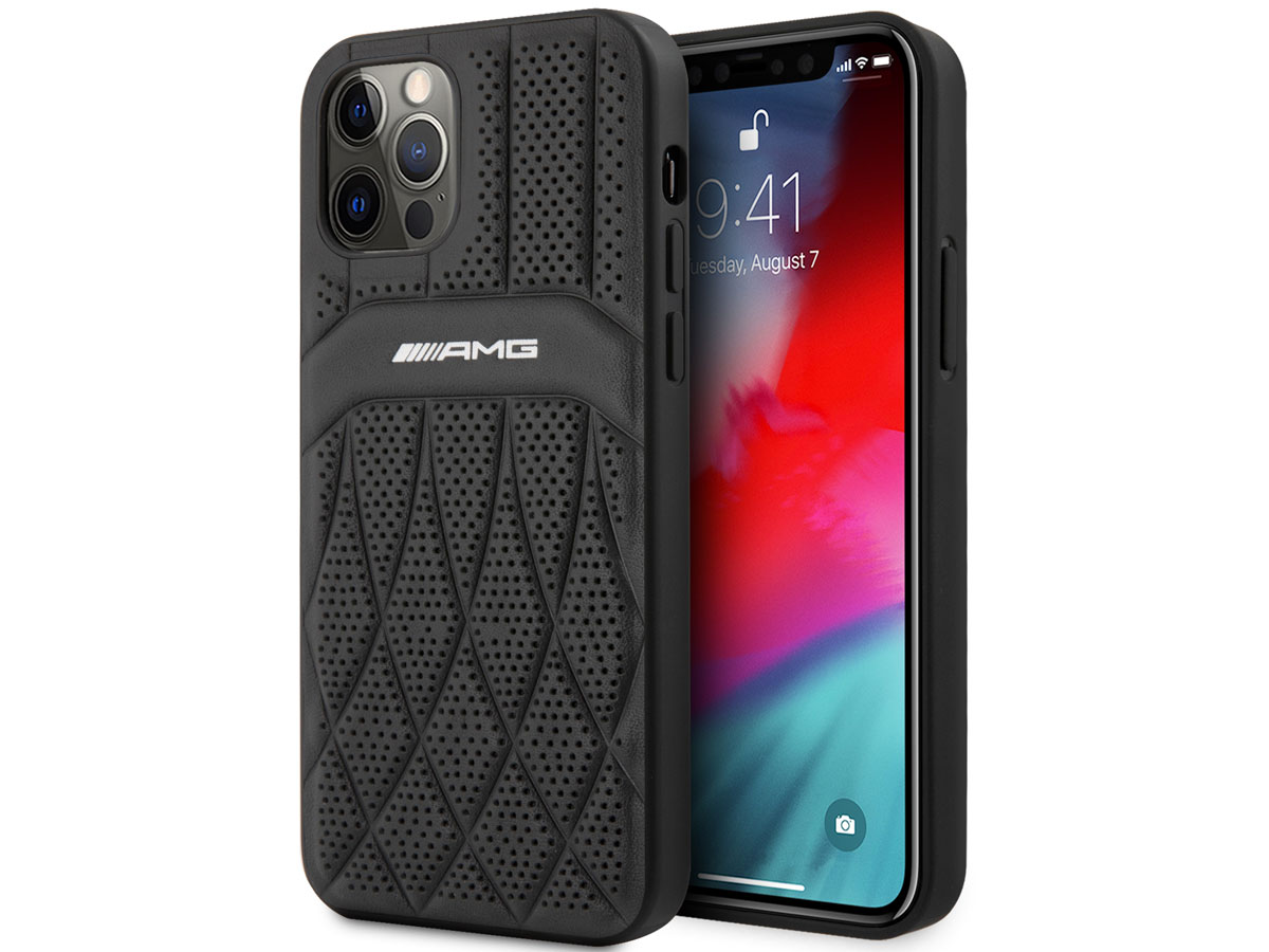 Dit Mercedes-AMG iPhone 12/12 Pro hoesje is onder officiële licentie gemaakt en biedt bescherming in de stijl van dit geliefde merk. De case is op de achterzijde bekleed met echt leer dat door middel van reliefdruk en perforaties is voorzien van een sportief design waar het AMG logo prominent op is aangebracht.