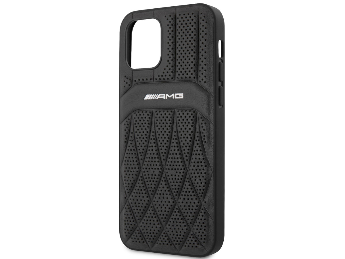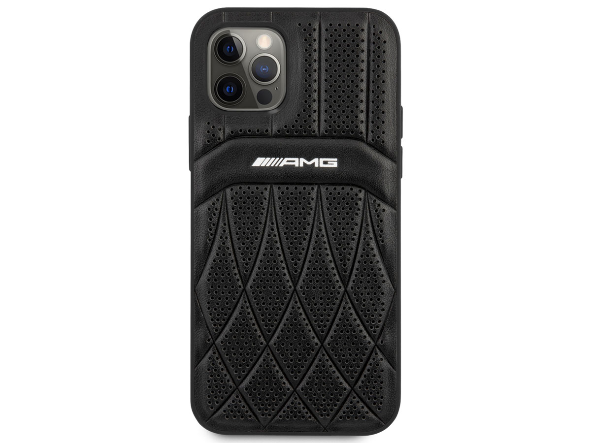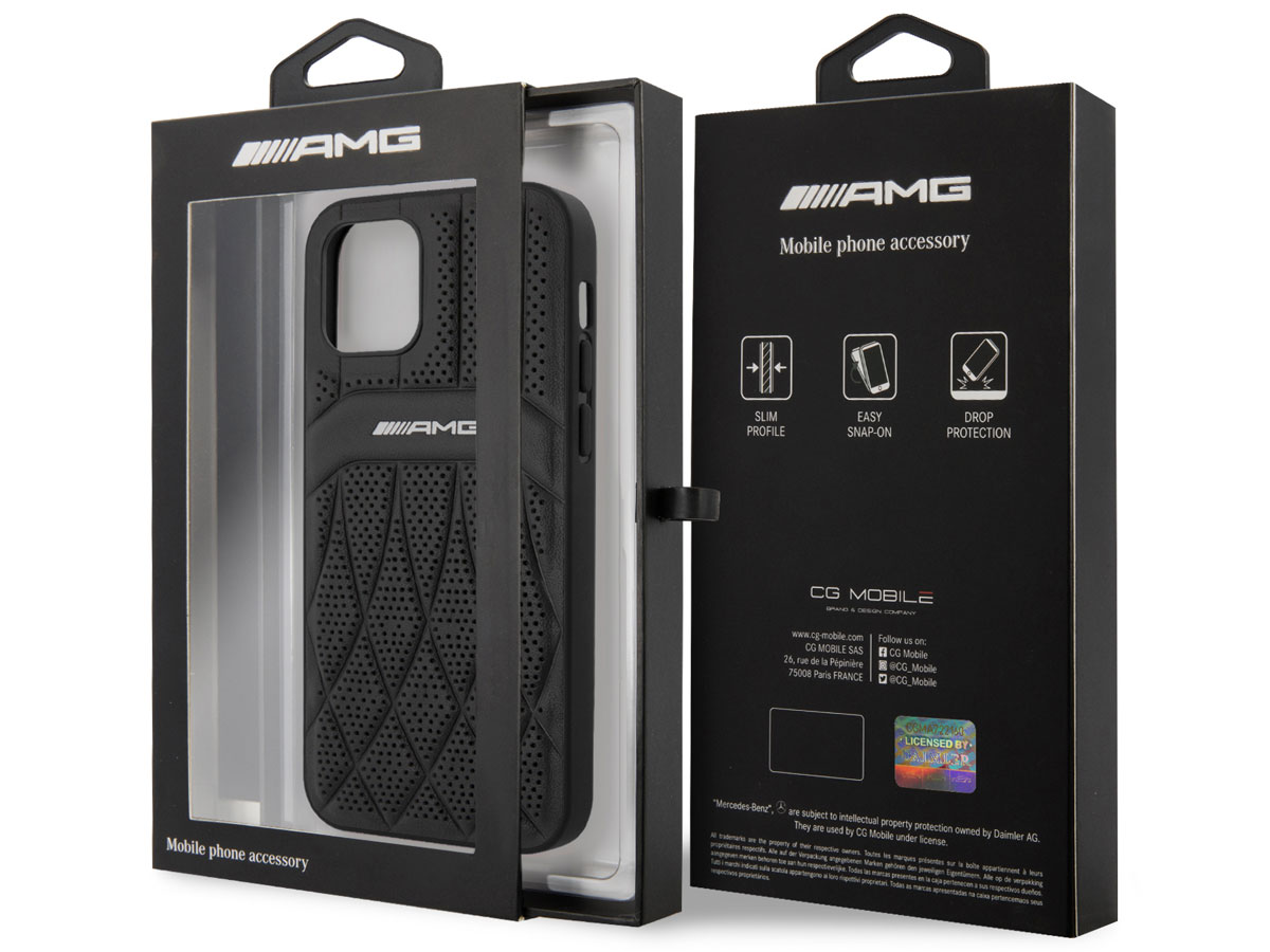 Dit Mercedes-AMG iPhone 12/12 Pro hoesje is onder officiële licentie gemaakt en biedt bescherming in de stijl van dit geliefde merk. De case is op de achterzijde bekleed met echt leer dat door middel van reliefdruk en perforaties is voorzien van een sportief design waar het AMG logo prominent op is aangebracht.