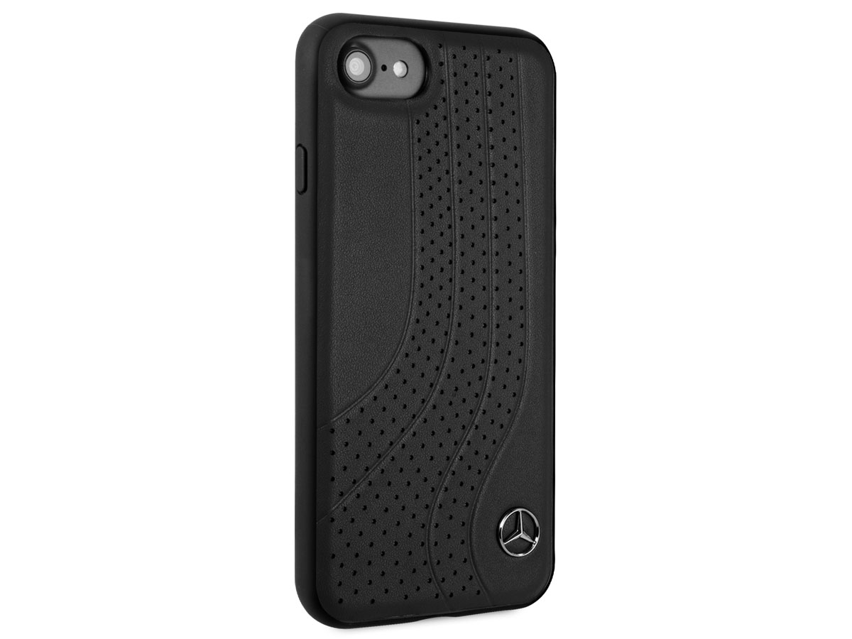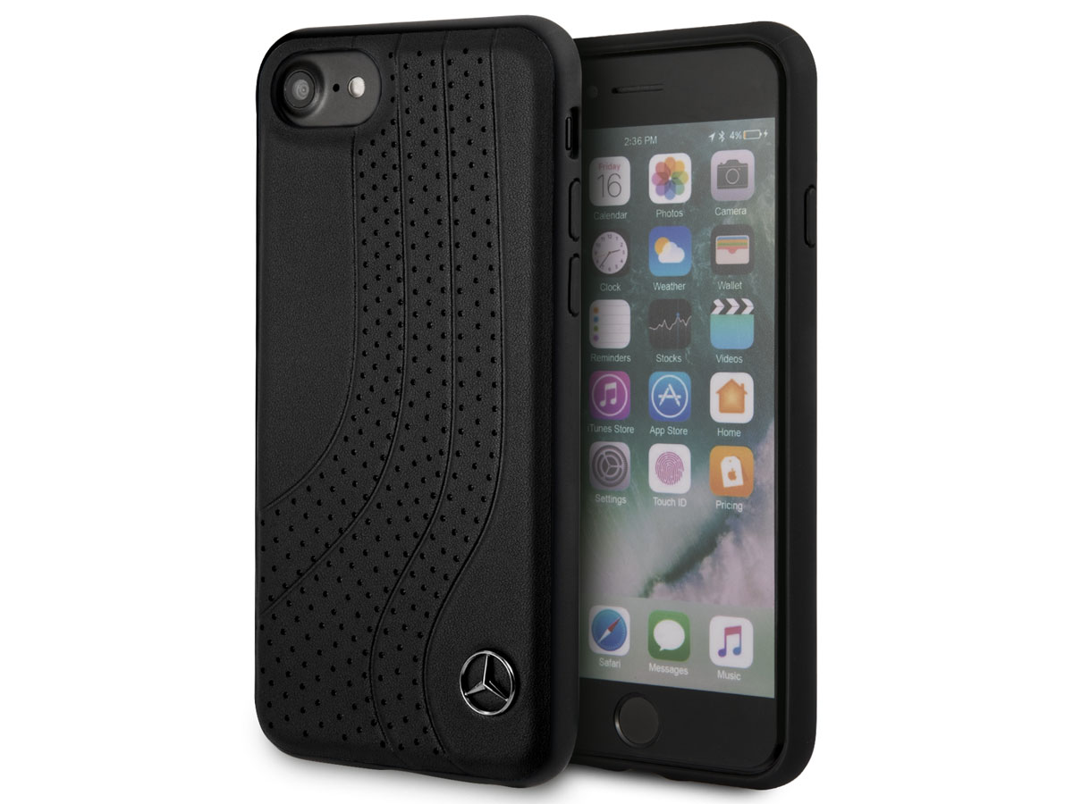 Dit originele Mercedes-Benz iPhone hoesje is speciaal ontworpen voor de iPhone 8, iPhone 7 en de iPhone 6/6s. De case is bekleed met echt leer, dat gedeeltelijk geperforeerd is voor een sportieve look. De zilveren Mercedes ster steekt mooi af bij de zwarte ondergrond.
