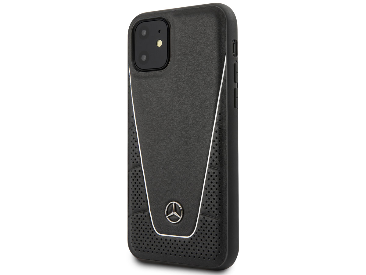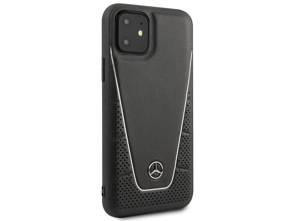 Dit Mercedes-Benz iPhone hoesje voor iPhone 11 en XR is onder officiële licentie gemaakt en biedt uw iPhone bescherming in de stijl van dit geliefde merk. De case is bekleed met echt leer dat gedeeltelijk geperforeerd is. De zilveren Mercedes ster is aangebracht binnen een vorm die doet denken aan de neus van een F1 auto.