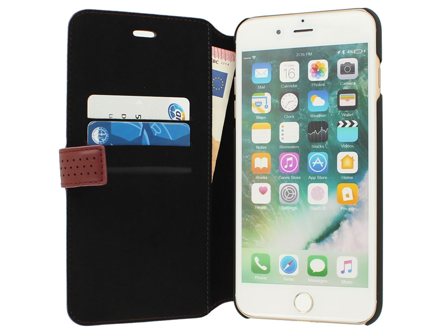 In de voering van het iPhone hoesje zitten meerdere vakjes waarin pasjes, visitekaartjes en briefgeld een plekje kunnen vinden.