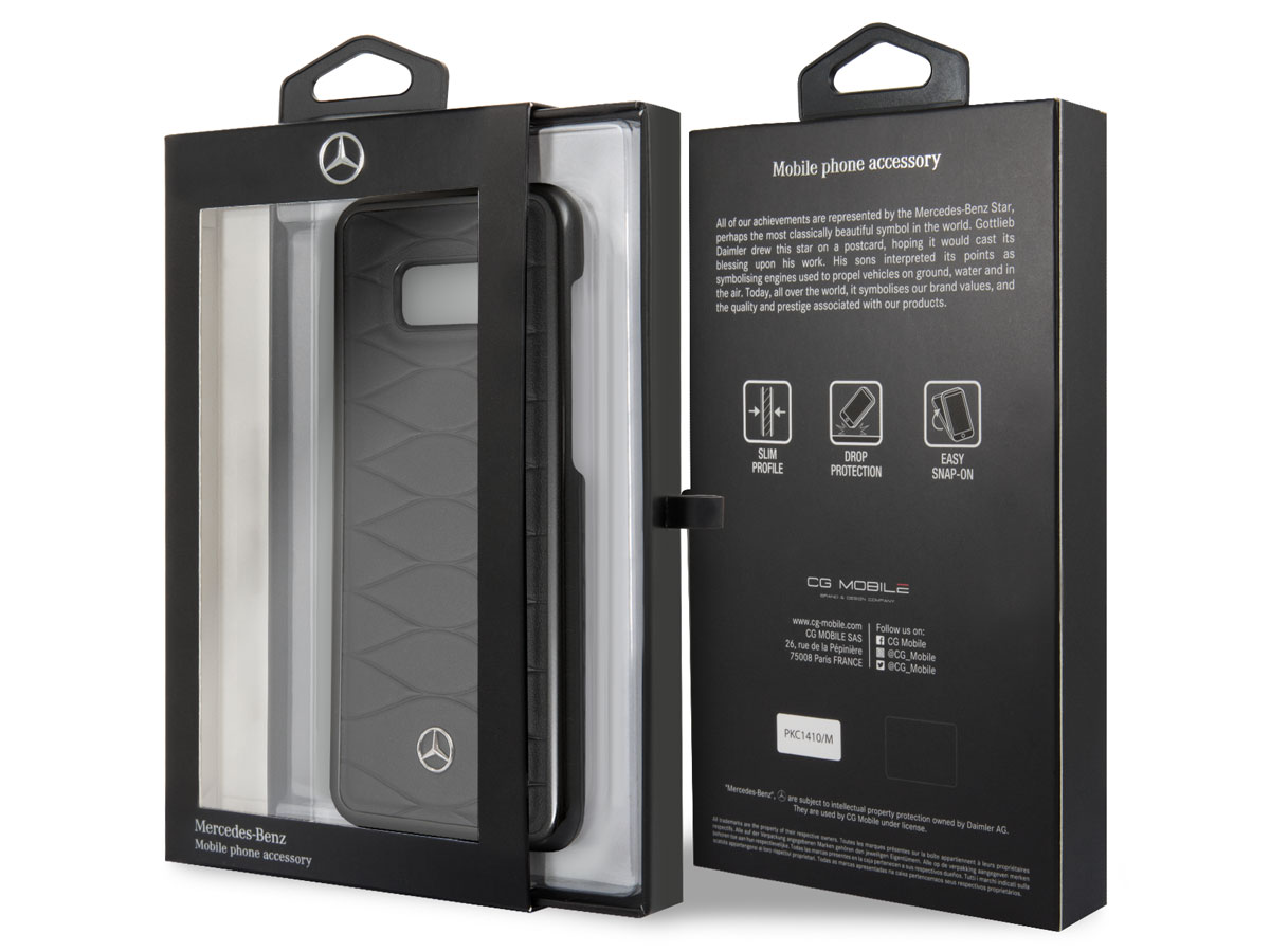 Dit fraaie Mercedes-Benz hoesje voor Galaxy S8+ beschermt uw toestel in stijl. De case heeft een basis van kunststof dat is bekleed met echt leer. Hierin is een fraai patroon aangebracht, waarop de zilveren Mercedes ster is aangebracht.