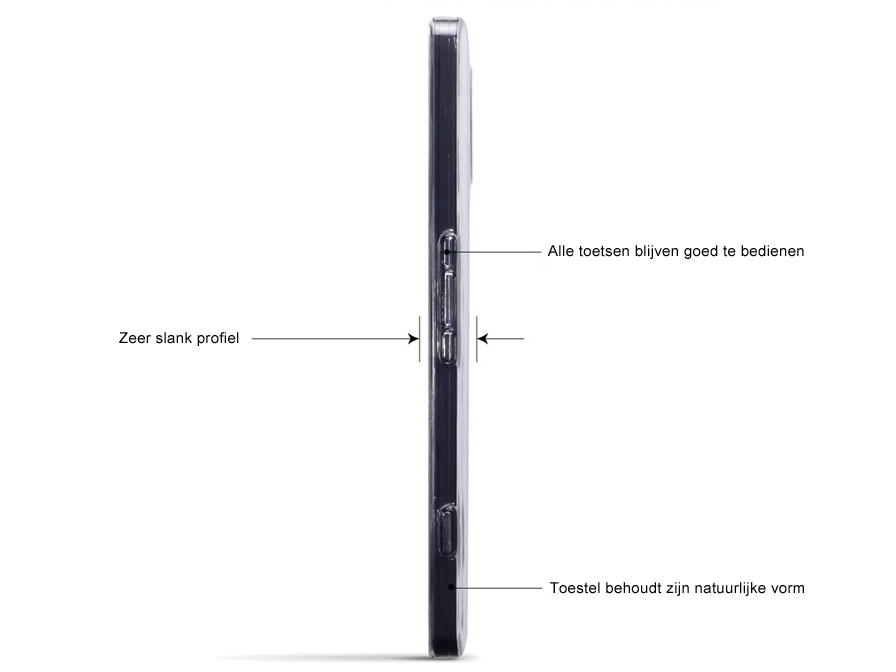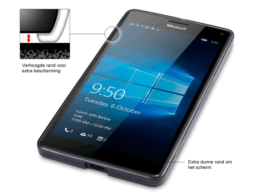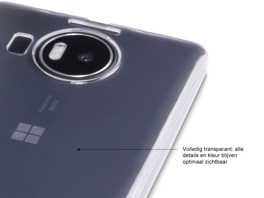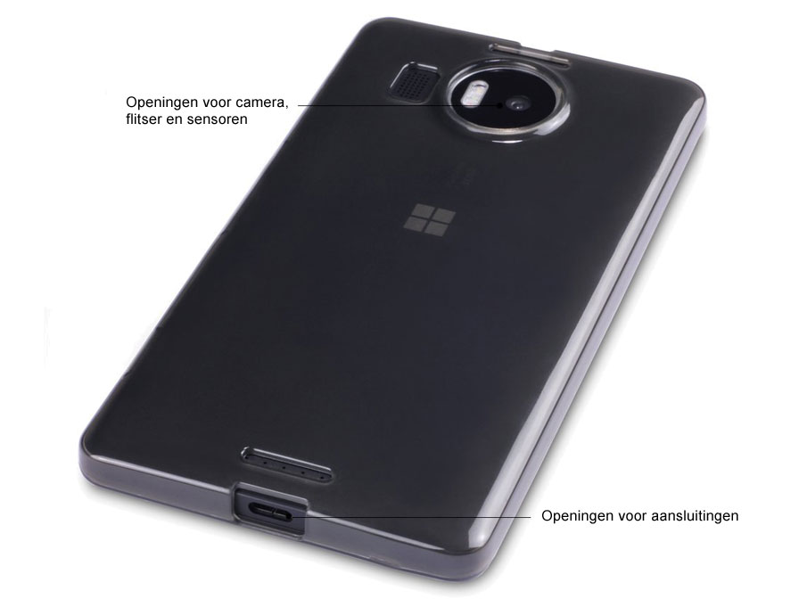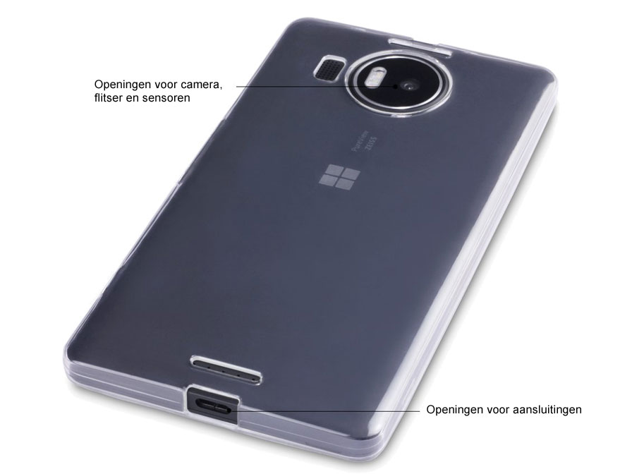 Ook optisch behoudt de Microsoft Lumia 950 XL met hoesje een slanke look doordat het materiaal geheel doorzichtig is. Met alle toetsen van de smartphone is rekening gehouden in het ontwerp van het hoesje, en ook voor alle aansluitingen, camera en flitser zijn openingen gemaakt.