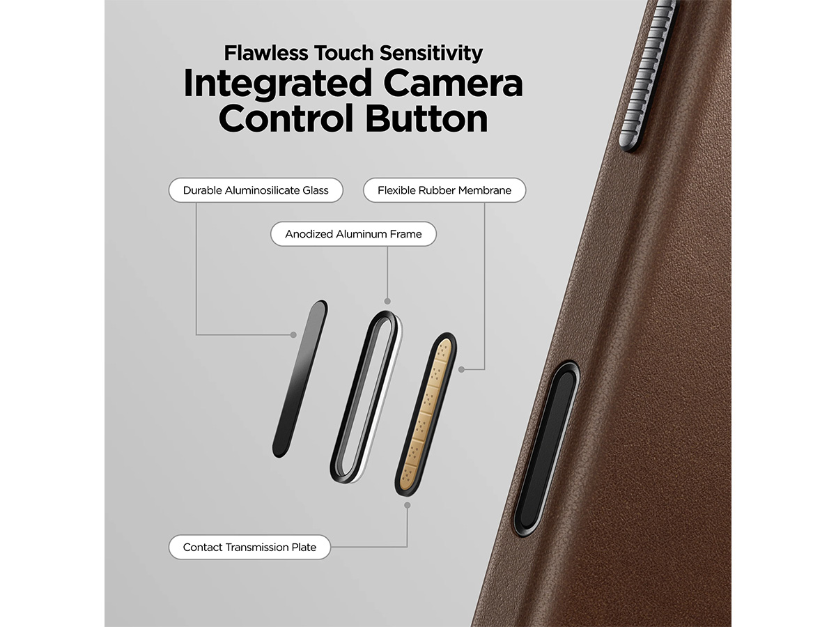 Dit Nomad iPhone 17 Pro Max hoesje bevat een geavanceerd stukje technologie op de plek van de Camera Button van de iPhone. Een aanraakgevoelige, meerlaagse knop van glas en aluminium zorgt ervoor dat u deze knop volledig kunt blijven bedienen zoals Apple het bedoeld heeft.