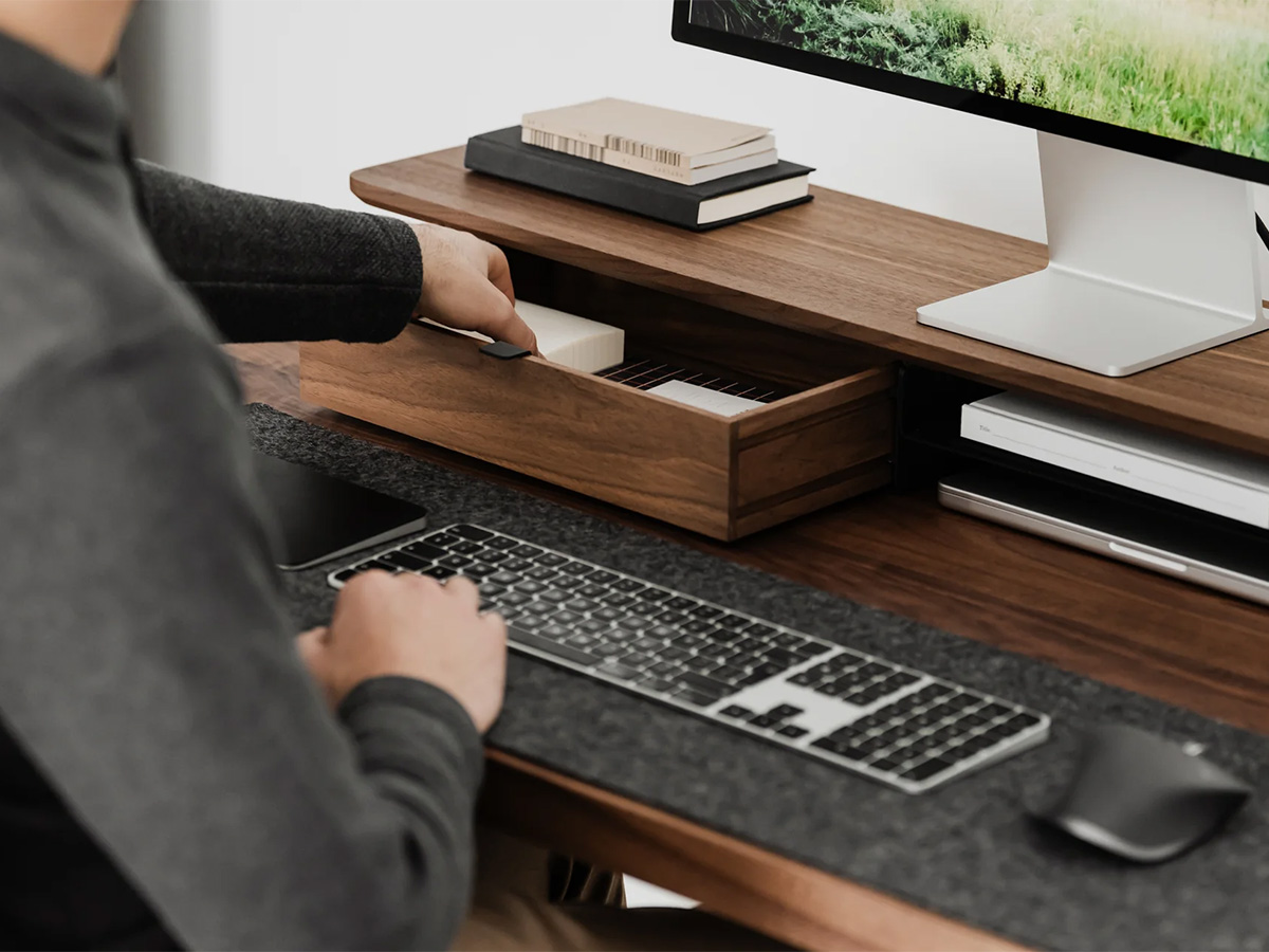 Deze ruime la is, net als de Desk Shelf zelf, gemaakt van massief eikenhout en schuift in een basis van gepoedercoat staal. De kwaliteit is hierdoor exceptioneel goed.