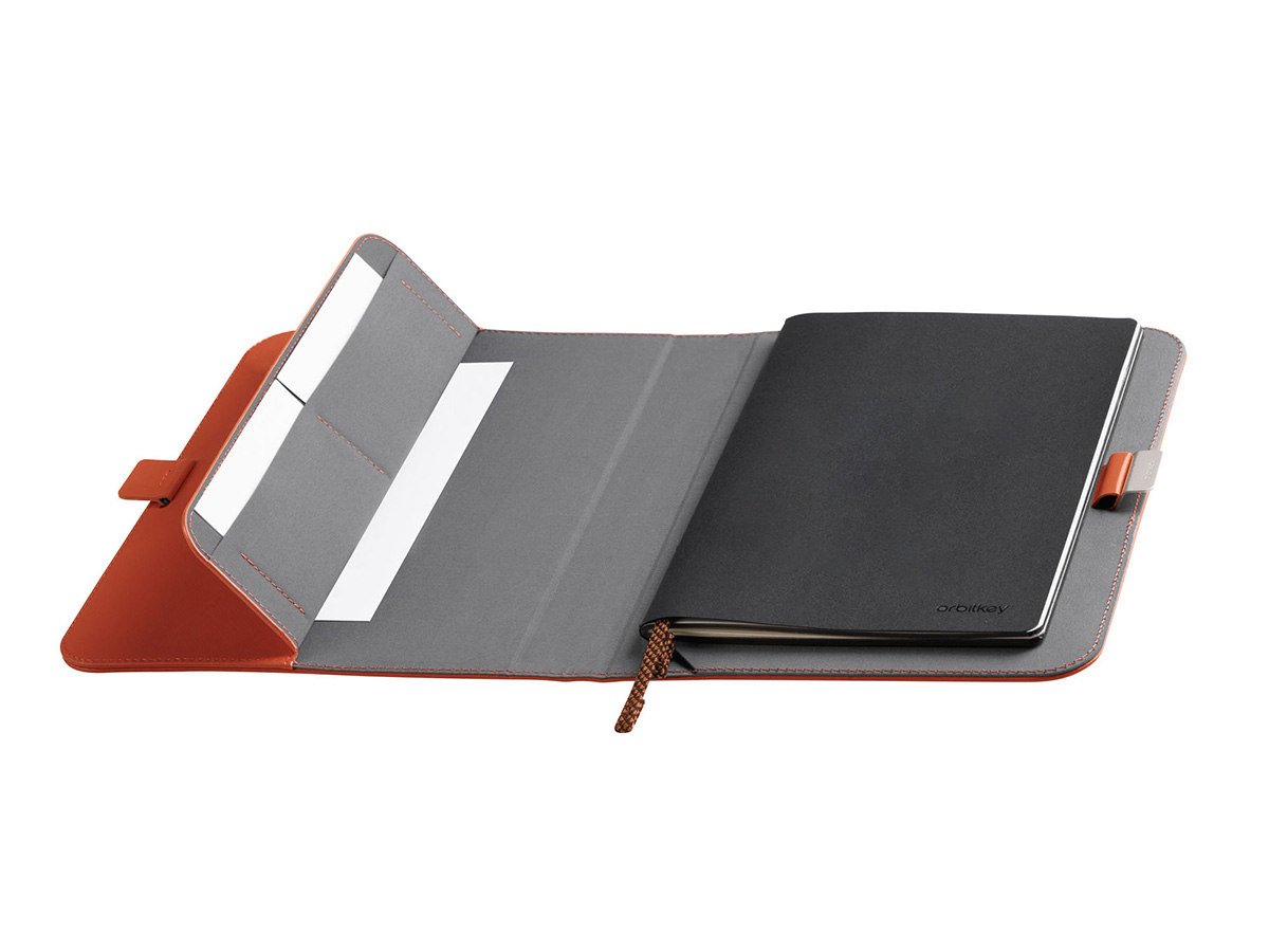 De Orbitkey Compendium A5 wordt geleverd met een Orbitkey notitieblok met 96 pagina's (48 vellen) FSC gecertificeerd papier. De map is geschikt voor notitieblokken of notitieboeken van maximaal 21,8 x 15,5 x 2 cm en compatible met de producten van merken als Moleskine, Rhodia en Leuchtturm. De Compendium A5 zelf meet 23,2 x 18,5 cm en weegt 300 gram.