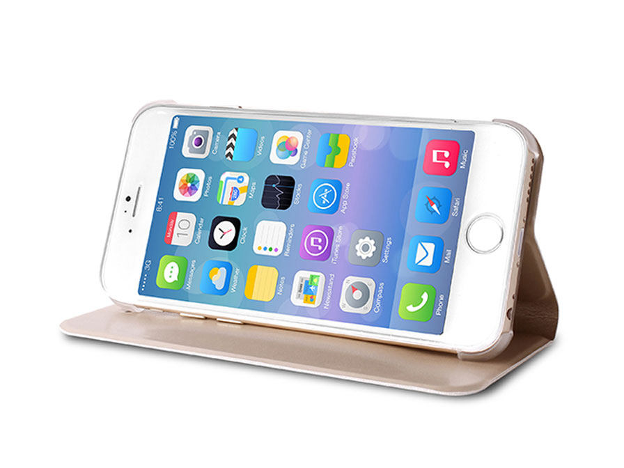 De iPhone 6/6S case opent als een boekje en biedt naast plek voor de iPhone ook ruimte voor pasjes of visitekaartjes. Bovendien kan het hoesje dienst doen als standaard voor de iPhone 6/6S.