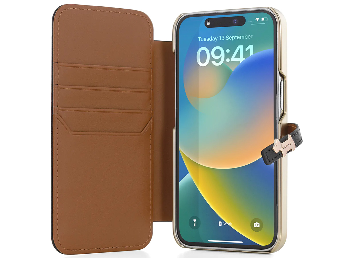 Dit luxueuze Radley London iPhone 14 Pro Max hoesje is uitgevoerd in stijlvol zwart. De schattige Schotse Terrier uit het logo van Radley London siert als metalen logo de magneetsluiting van het hoesje. De case heeft een goudkleurige basis met matchend logo achterop.