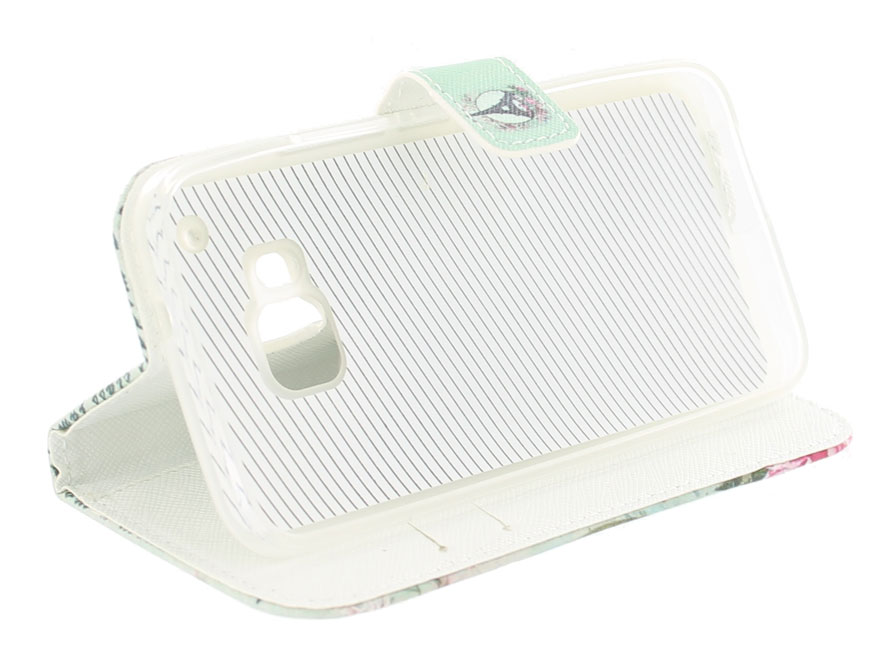 Naast bescherming biedt het hoesje ook functionaliteit: het hoesje kan als standaard gebruikt worden om de One M9 rechtop neer te zetten, en er zijn handige vakjes waarin pasjes, bonnetjes en papiergeld in opgeborgen kunnen worden.