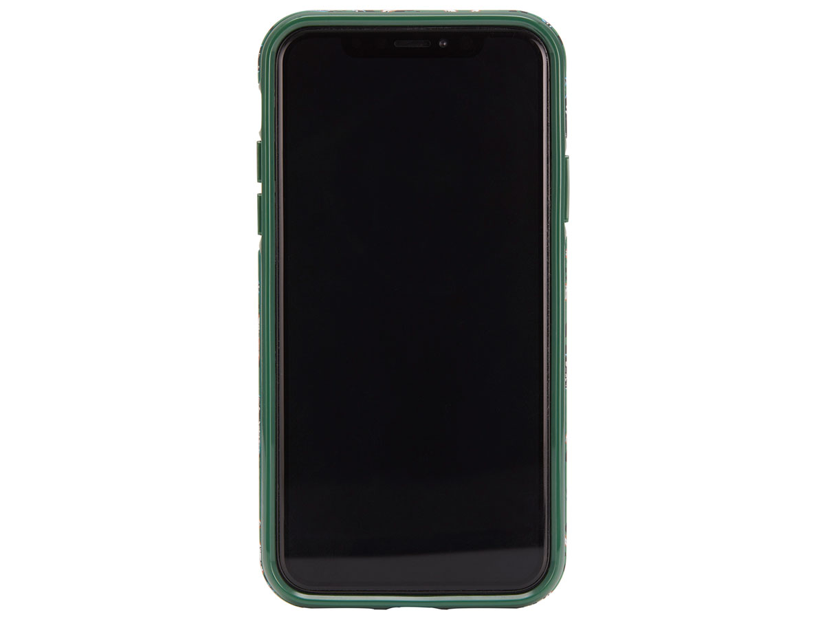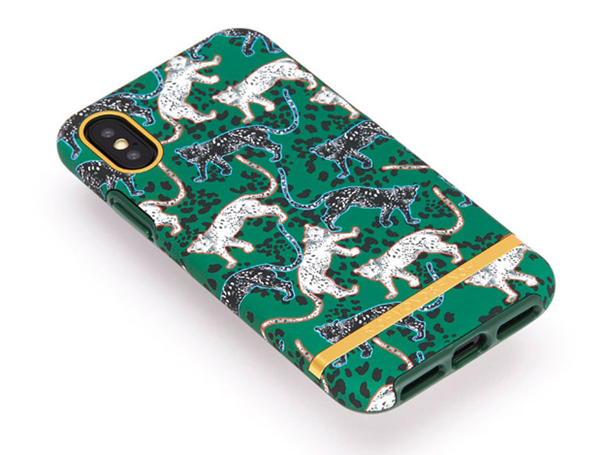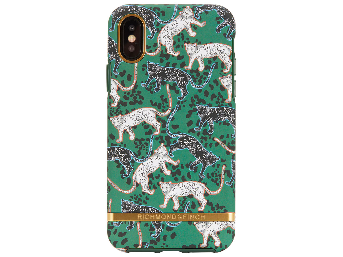 Dit bijzondere Richmond & Finch hoesje voor de iPhone Xs Max is uitgevoerd in de Green Leopard print. De voor dit merk kenmerkende metalen strip is bij dit design uitgevoerd in een contrasterende gouden kleur.