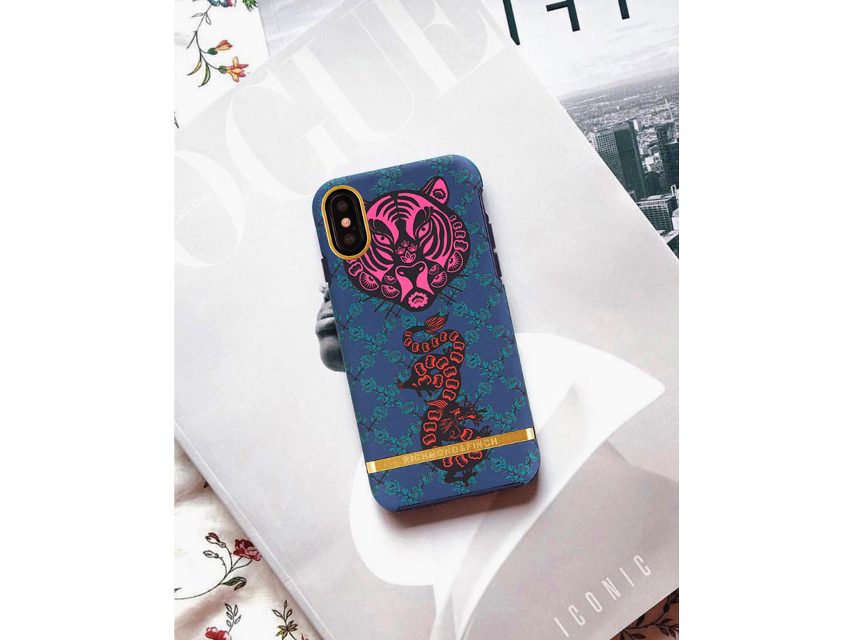Dit bijzondere Richmond & Finch hoesje voor de iPhone Xs Max is uitgevoerd in de Tiger & Dragon print. De voor dit merk kenmerkende metalen strip is bij dit design uitgevoerd in een contrasterende gouden kleur.