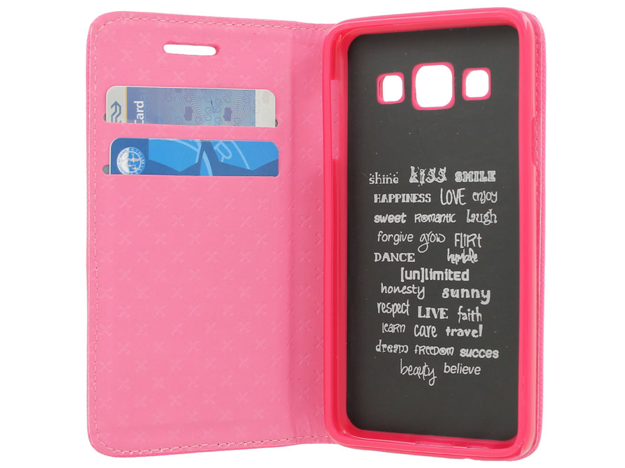In het smartphonehoesje zitten verder twee vakjes waarin een pinpas, OV chipkaart of schoolpasje opgeborgen kan worden. Tot slot kan het Samsung Galaxy A3 hoesje ook nog eens dienst doen als standaardje. Super handig dus!