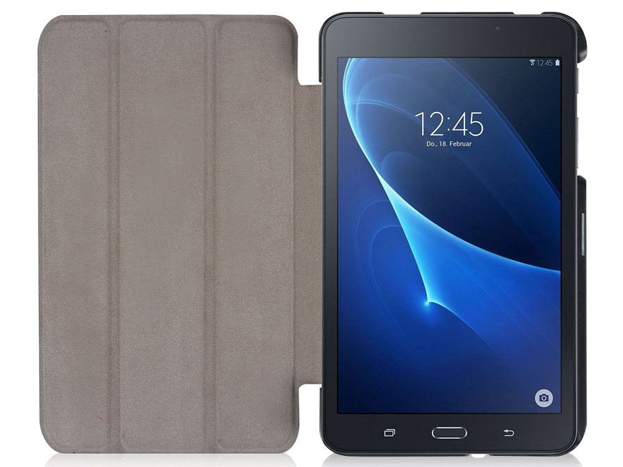 De voorklep van het Galaxy Tab A 2016 7.0 hoesje kan eenvoudig in drie delen opgerold worden om zo een standaard voor de tablet te vormen. Ook kan de tablet licht hellend neergezet worden om prettig op het scherm te typen.