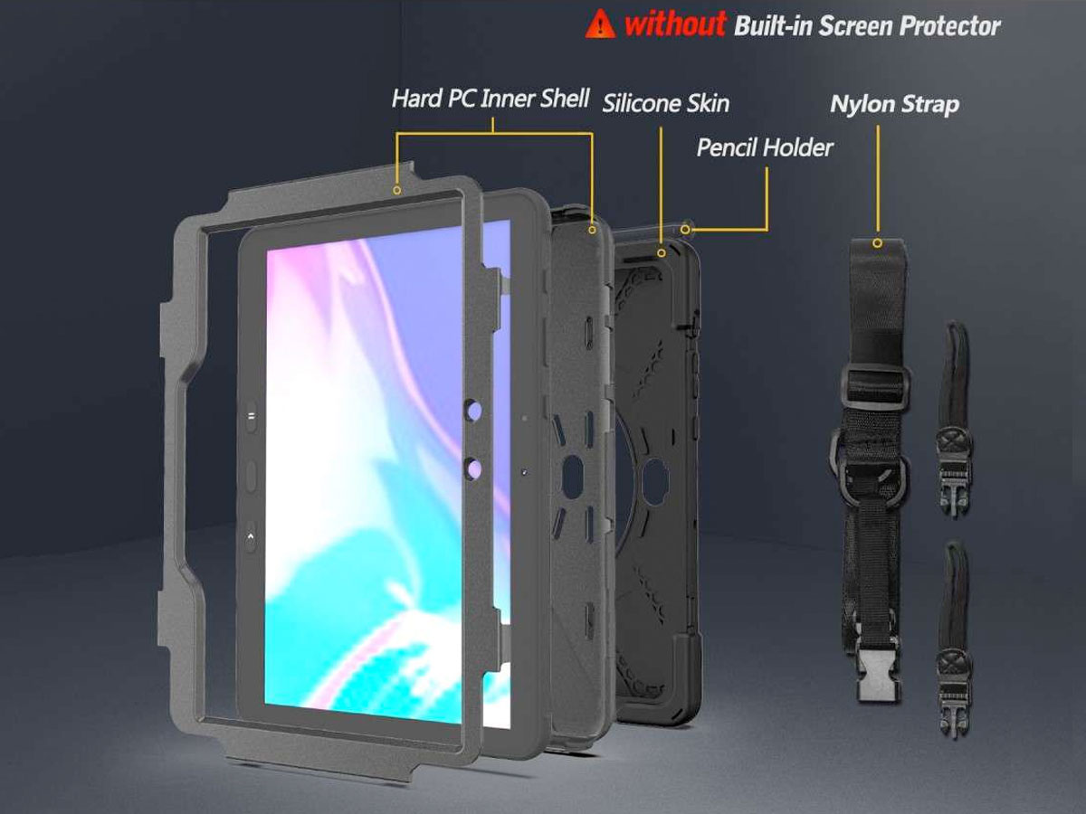 Los van al deze functionaliteit is de bescherming van deze Samsung Galaxy Tab Active Pro case eigenlijk al reden genoeg om voor dit hoesje te kiezen. Een meerlaags design, bestaande uit impactbestendig polycarbonaat en schokabsorberend TPU zorgt voor een hoogstaande bescherming bij stoten, vallen en meer. De case beschikt echter níét over een geïntegreerde screenprotector. Om de bescherming compleet te maken kunt u met korting een Samsung Galaxy Tab Active Pro screenprotector mee bestellen. Zie elders op deze pagina!