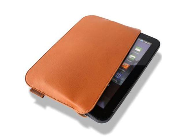 De fraaie sleeve van echt leer is perfect op maat voor de 7" Galaxy Tab en beschermt deze effectief. De binnenzijde van de sleeve is gevoerd met zacht materiaal om krassen op de Galaxy Tab te voorkomen. De sleeve, verkrijgbaar in de chique kleuren zwart en cognac, zien er daarnaast buitengewoon stijlvol uit dankzij het strakke, eenvoudige design.