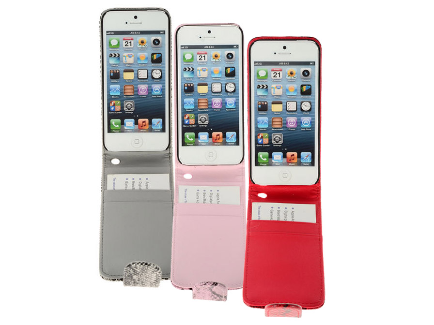 Deze fraaie cases zijn speciaal voor de iPhone 5 en iPhone 5S ontworpen. De kunstleren buitenzijde is voorzien van een slangenleer-relief en verkrijgbaar in 3 stijlvolle kleurvariaties. Binnenin de case vindt u een kunststof houder waar de iPhone SE/5s/5 netjes inklikt. Het scherm blijft geheel vrij voor optimaal bedieningsgemak. De case is dicht te klappen waarna de leren flap over de voorzijde het scherm beschermt. De case sluit met een magneetsluiting en is als geheel zeer compact.