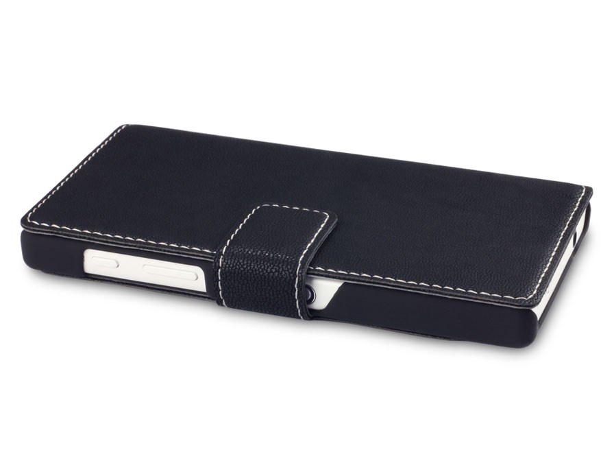 De Sony Xperia Z5 Compact klikt eenvoudig vast in het hoesje dankzij de op maat gemaakte houder van polycarbonaat. Het hoesje kan vervolgens als een boekje dichtgevouwen worden en sluit af met een magneetsluiting. Het Xperia Z5 Compact telefoonhoesje is zo ontworpen dat het toestel volledig functioneel blijft, onder andere dankzij uitsparingen voor alle toetsen, aansluitingen en de camera.