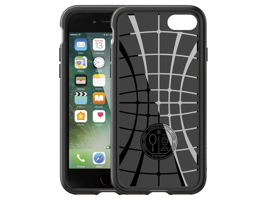 De basis van het Spigen hoesje wordt gevormd door een onbreekbare, schokabsorberende skin van zwart TPU. Daaroverheen klikt een sterke polycarbonaat bumper, die bovendien in 3 fraai bij de iPhone 8/7 passende kleuren verkrijgbaar is.
