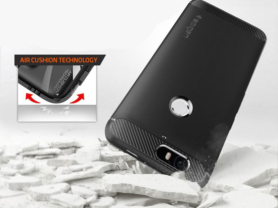 Het Spigen Huawei Nexus 6P hoesje beschermt zeer doeltreffend. Niet alleen doordat het TPU materiaal onbreekbaar en schokabsorberend is, maar ook dankzij Air Cushion technology in de hoeken van de case. Deze kleine luchtkamers bieden extra bescherming bij een val. Een klein opstaand randje tilt het scherm van de Nexus 6P iets op zodat het niet in aanraking kan komen met vlakke oppervlakken.