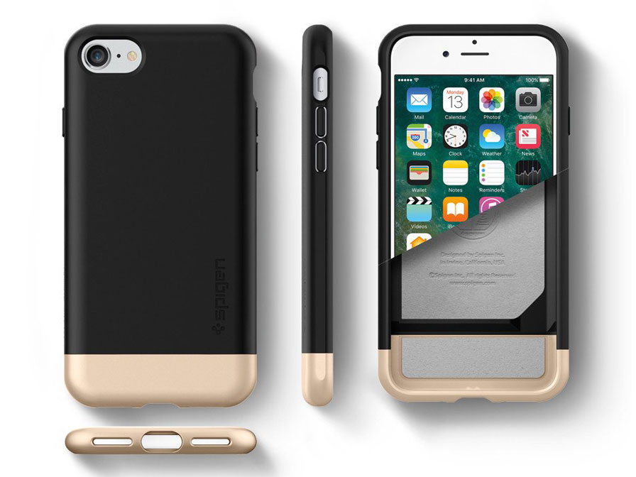 Het Spigen hoesje bestaat uit twee delen waarmee de case eenvoudig om het toestel schuift. Het iPhone 8/7 hoesje bedekt zo alle hoeken, alle zijkanten en de achterzijde, en biedt ook het scherm beschutting door een klein opstaand randje.