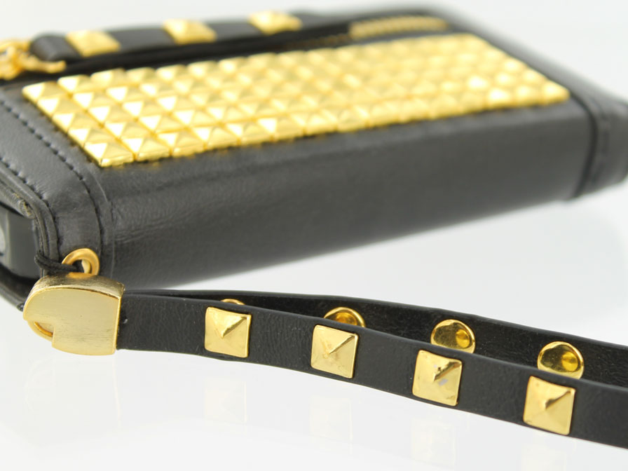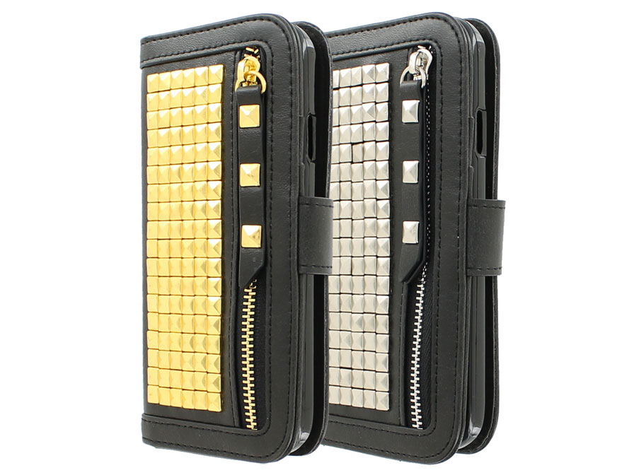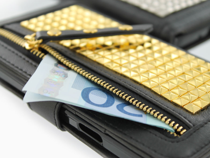Dit fraaie Galaxy S4 hoesje is speciaal op maat gemaakt voor dit toestel. De case is op prachtige wijze voorzien van vierkante studs, die met de hand op de case zijn aangebracht. Ook op de ritssluiting en het bijgeleverde polsbandje komen de studs terug.
