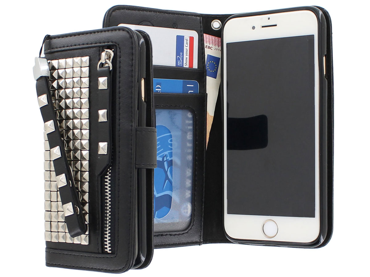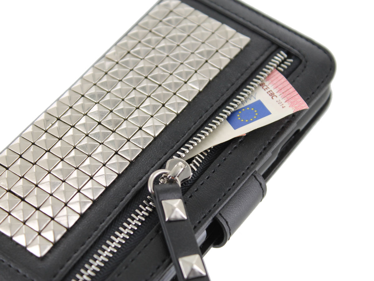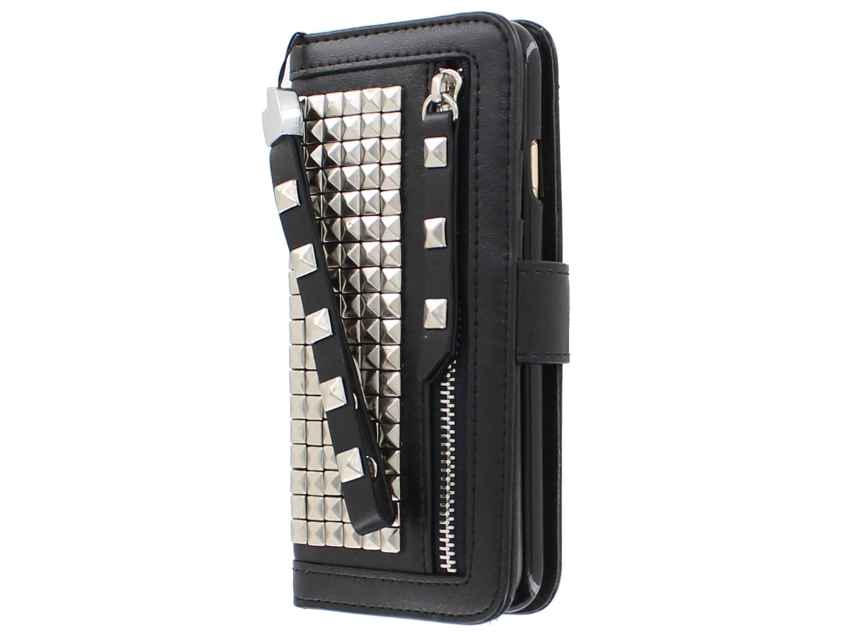 Dit bijzondere iPhone 6/6s hoesje is rijkelijk bezet met tientallen goudkleurige studs, wat in combinatie met het zwarte kunstleer een stoere look geeft aan de case. Het hoesje is bovendien voorzien van een goudkleurige rits die toegang geeft tot een vakje voorop en komt met een matchend polsbandje.