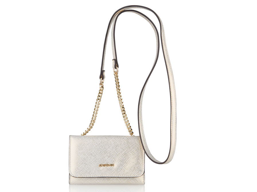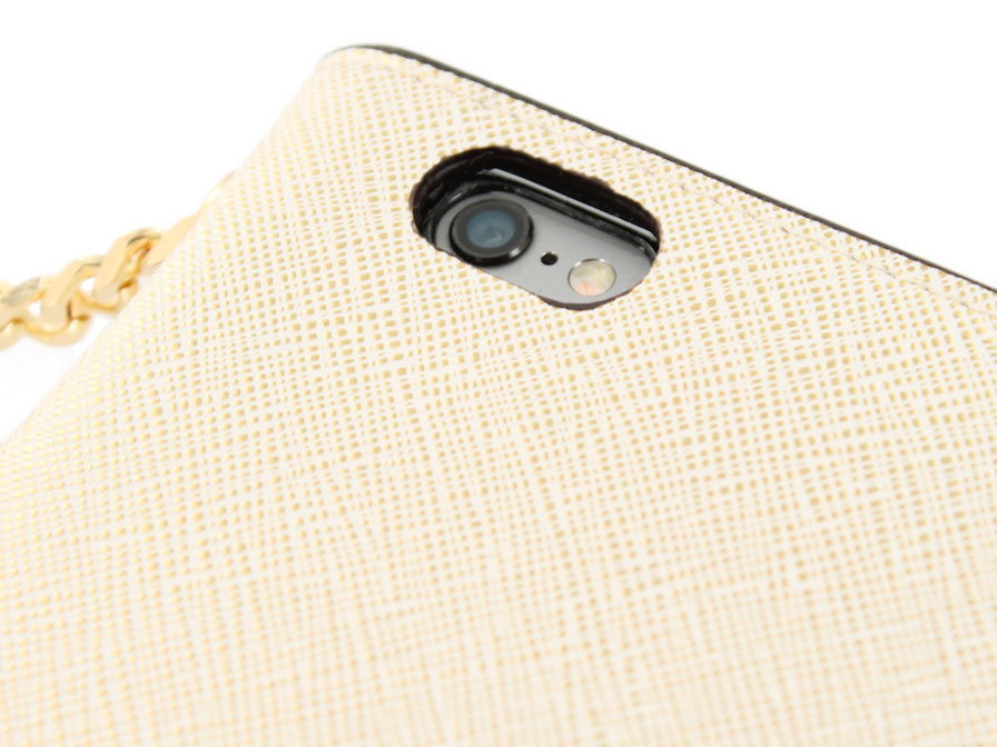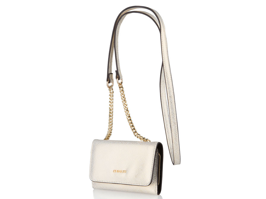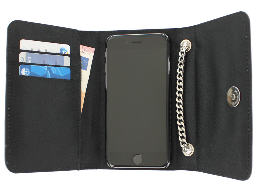 Het iPhone-hoesje is feitelijk een soort clutch die in drieën opengevouwen kan worden. In het hoesje is naast ruimte voor de iPhone ook plaats voor pasjes, visitekaartjes, briefgeld en bonnetjes. Het telefoonhoesje heeft bovendien een schouderband met metalen schakels.