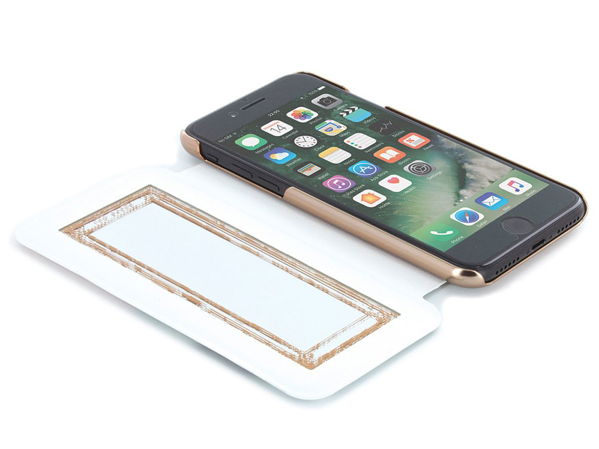 In de voering van het Ted Baker hoesje zit een handig spiegeltje voor de snelle check-up. Het toestel zelf blijft uiteraard volledig functioneel in het iPhone 7 / 6s hoesje: met alle toetsen, aansluitingen en de camera is rekening gehouden.