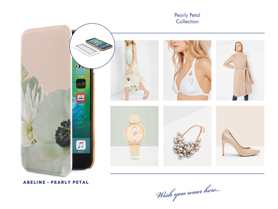 De iPhone case is uitgevoerd in de "Pearly Petal" print uit de nieuwste Ted Baker collectie, in combinatie met een goudkleurige rand en Ted Baker logo voorop het hoesje.