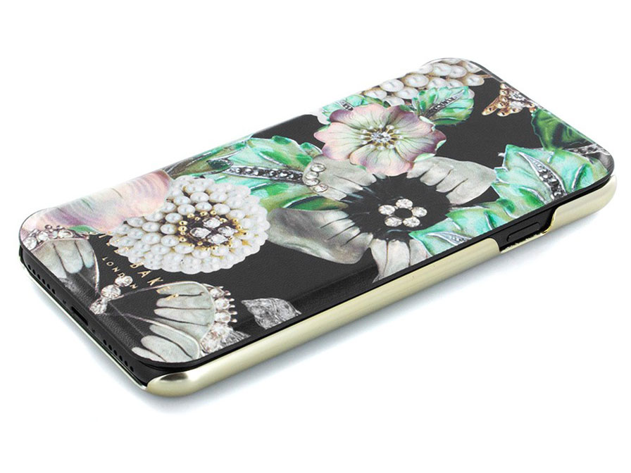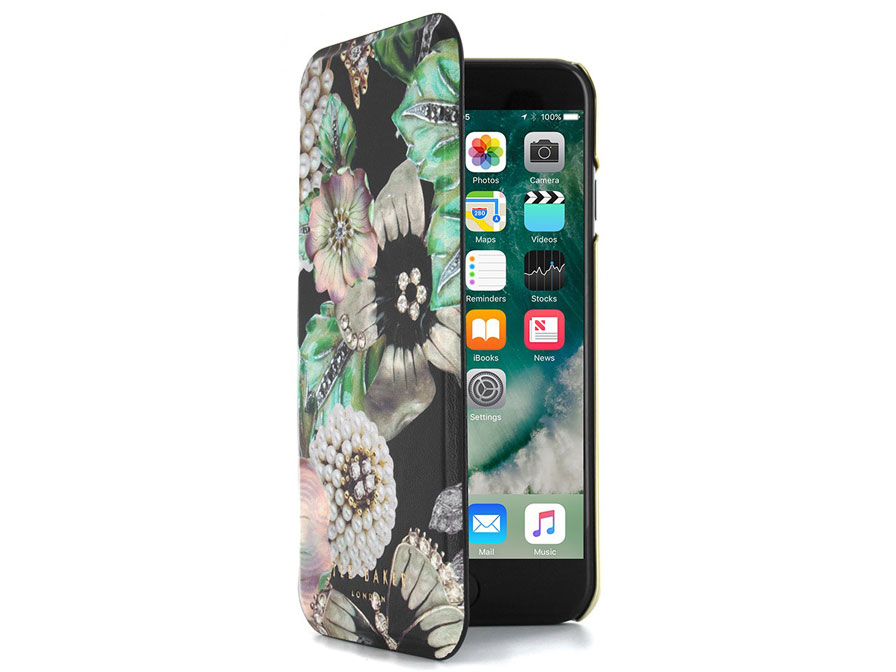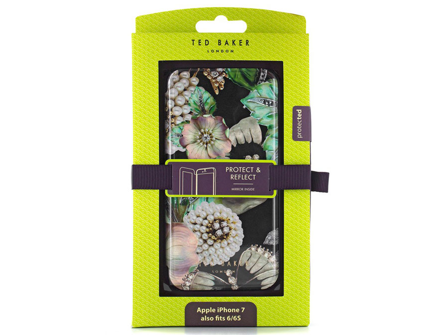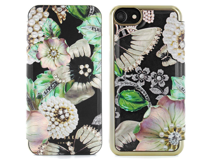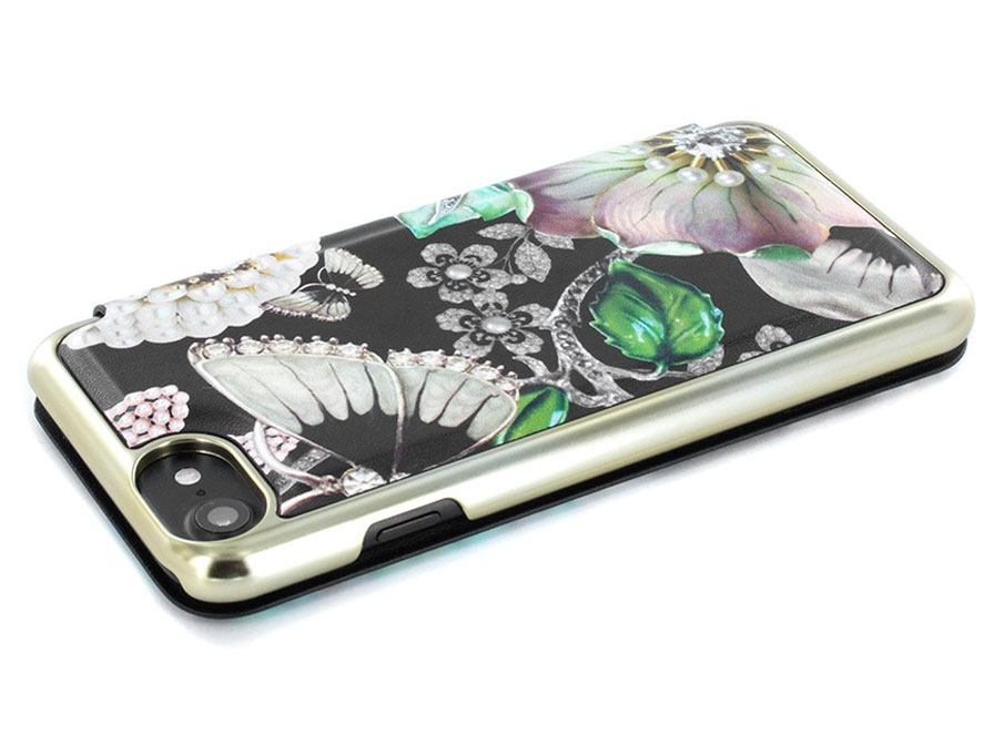 Dit fraaie Ted Baker iPhone hoesje draagt de naam Clarena en is geschikt voor zowel de iPhone 8, de iPhone 7 als de iPhone 6/6s. Het telefoonhoesje is uitgevoerd in een bijzondere, levensechte print met parels, bloemen en vlinders. De zwarte basis in combinatie met de goudkleurige rand maken het iPhone hoesje een echte blikvanger.