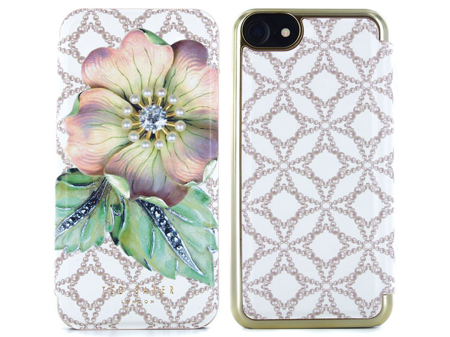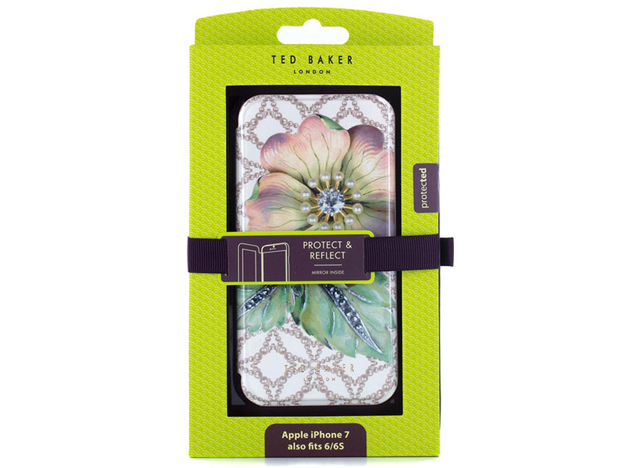 Dit fraaie Ted Baker iPhone hoesje met de naam Mavis en draagt een unieke print uit de nieuwste Ted Baker collectie. Op een ondergrond van parels in een geometrisch patroon is een levensechte bloemenprint aangebracht. De basis van het iPhone hoesje is uitgevoerd in glanzend goud en in de voering vindt u een fraai spiegeltje.