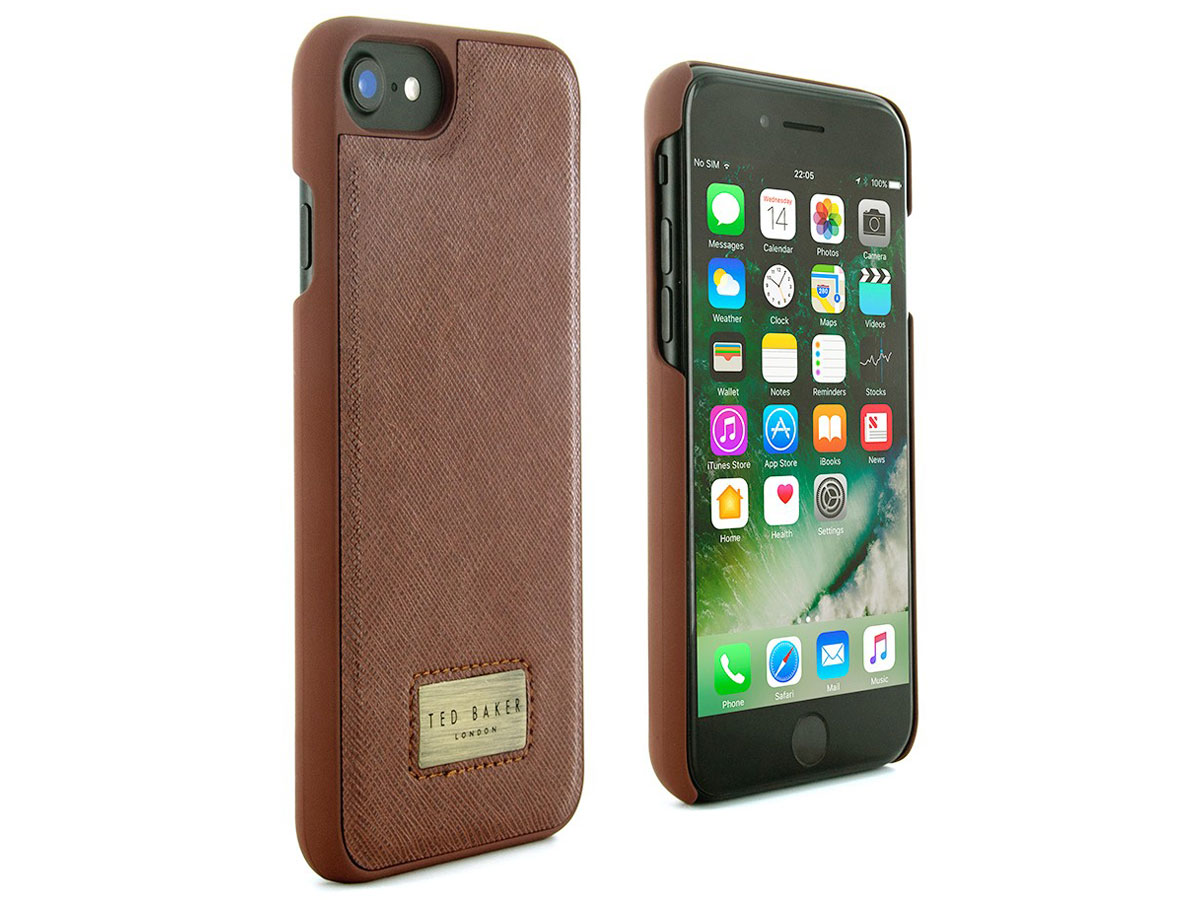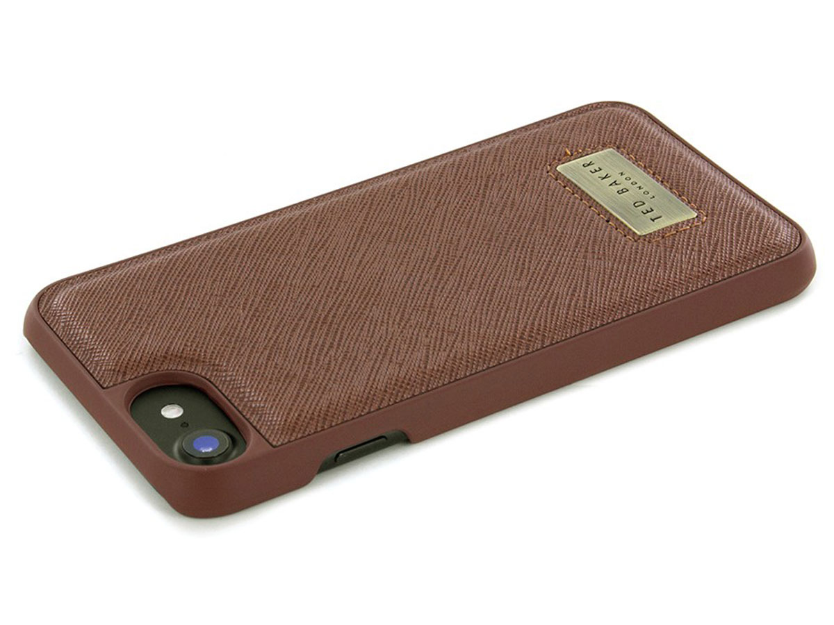 Het Ted Baker Haliday hoesje voor iPhone 8, iPhone 7 en iPhone 6/6s is een fraaie hard case in een klassiek bruine kleur. De cover heeft een polycarbonaat basis die is ingelegd met kunstleer. De luxueuze uitstraling wordt compleet gemaakt door het metalen TB logo achterop.