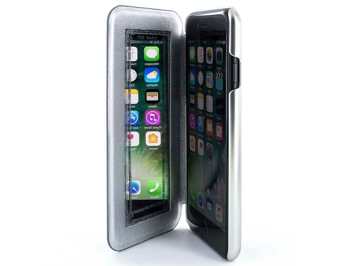 Het Ted Baker iPhone hoesje biedt bescherming rondom met een klepje over het scherm, waar aan de binnenkant een handig spiegeltje in zit. De iPhone case heeft een onzichtbaar weggewerkte magneetsluiting die het hoesje een zeer slank design geeft. Bovendien houdt de sluiting het klepje ook geopend vast: erg handig in het gebruik.