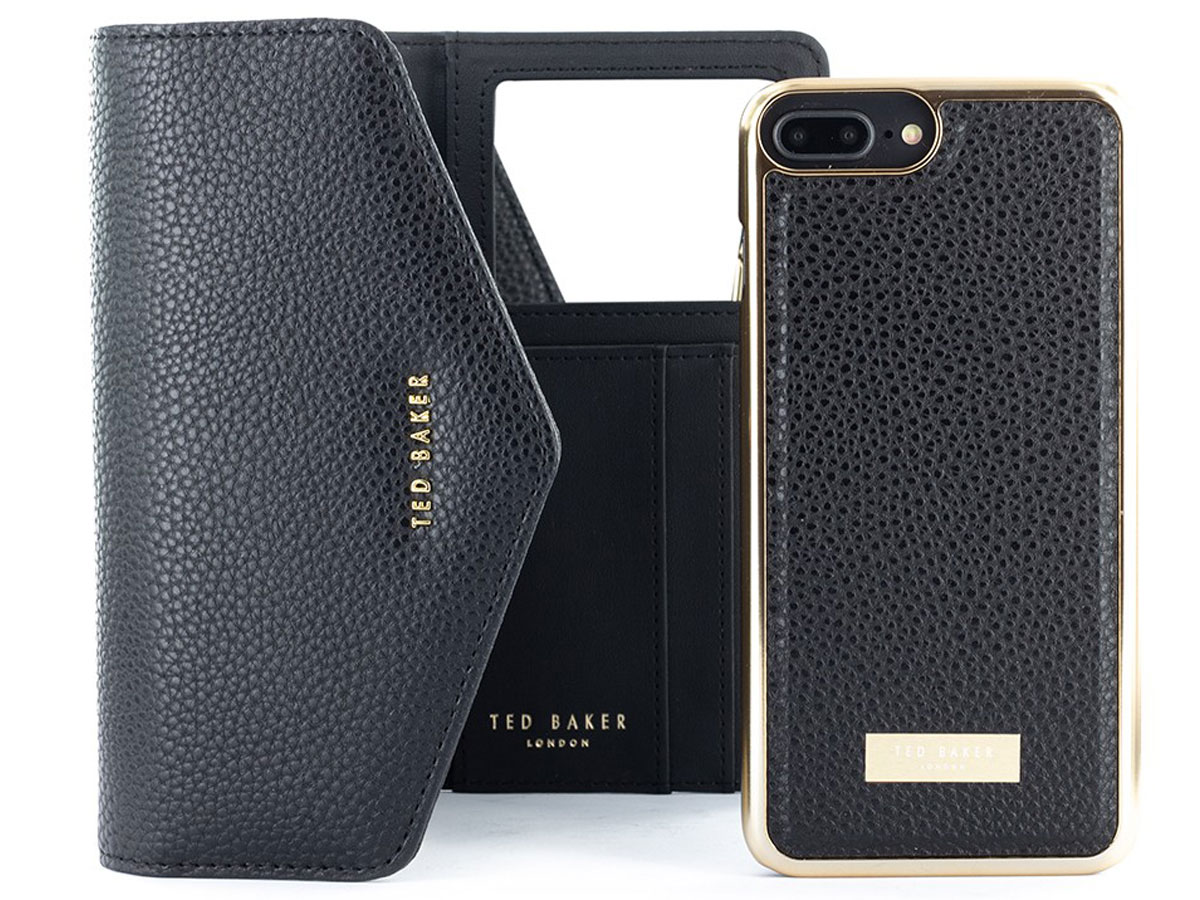 Het Ted Baker iPhoen hoesje dat magnetisch in de wallet bevestigd zit is specifiek op maat gemaakt voor de iPhone 8 Plus, iPhone 7 Plus en iPhone 6/6s Plus. De case is uitgevoerd in hetzelfde zwarte pebbled vegan leather met goudkleurige details als de wallet zelf, waardoor ze perfect bij elkaar matchen.