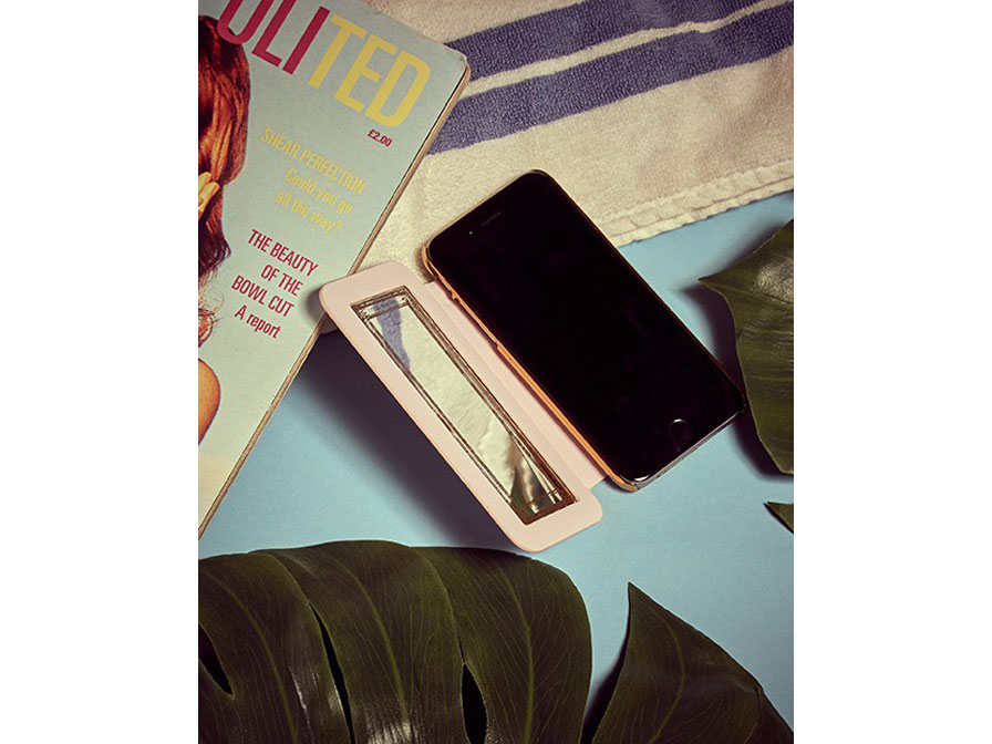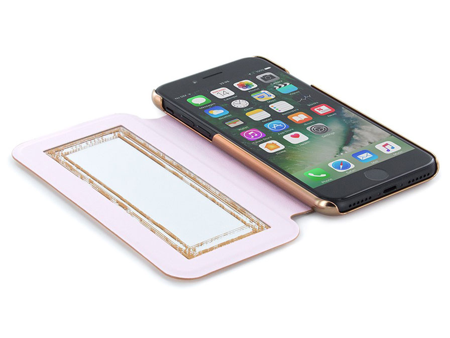 In de voering van het Ted Baker hoesje zit een handig spiegeltje voor de snelle check-up. Het toestel zelf blijft uiteraard volledig functioneel in het iPhone 8/7/6 hoesje: met alle toetsen, aansluitingen en de camera is rekening gehouden.