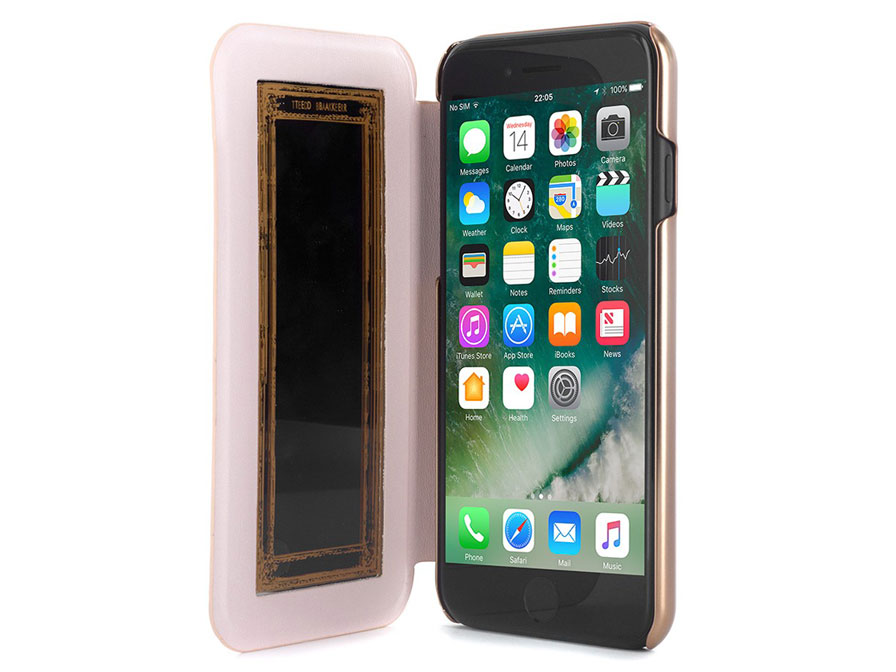 Het iPhone 6/6s hoesje klikt eenvoudig om het toestel en laat daarbij alle toetsen, aansluitingen en de camera vrij. In het Ted Baker hoesje vindt u een handig spiegeltje met TB logo.