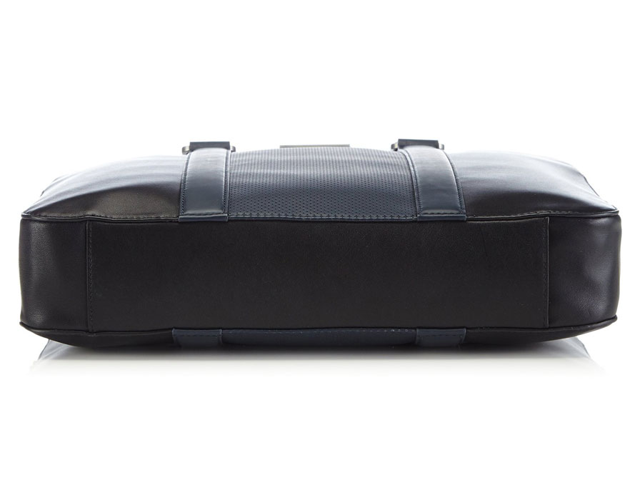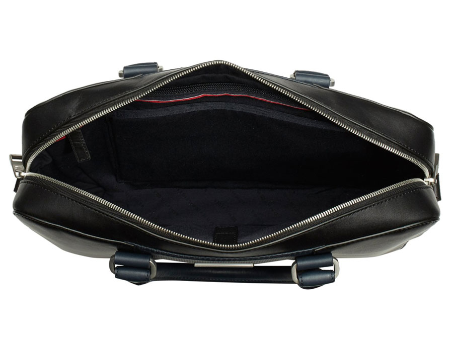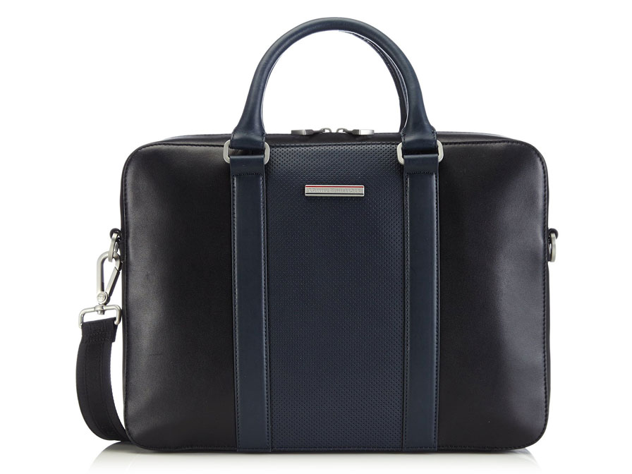 Deze luxe Tommy Hilfiger Albert laptoptas is volledig gemaakt van echt leder. De tas is uitgevoerd in zwart met een donkerblauw middenstuk van geperforeerd leer dat een sportief tintje aan de laptoptas geeft. Voorop de tas zit een mooi metalen Tommy Hilfiger logo.