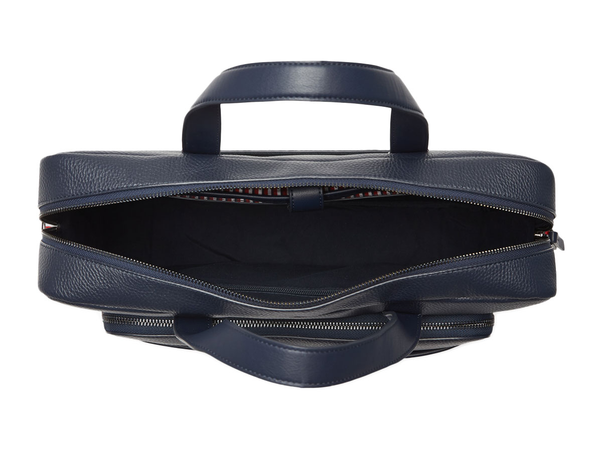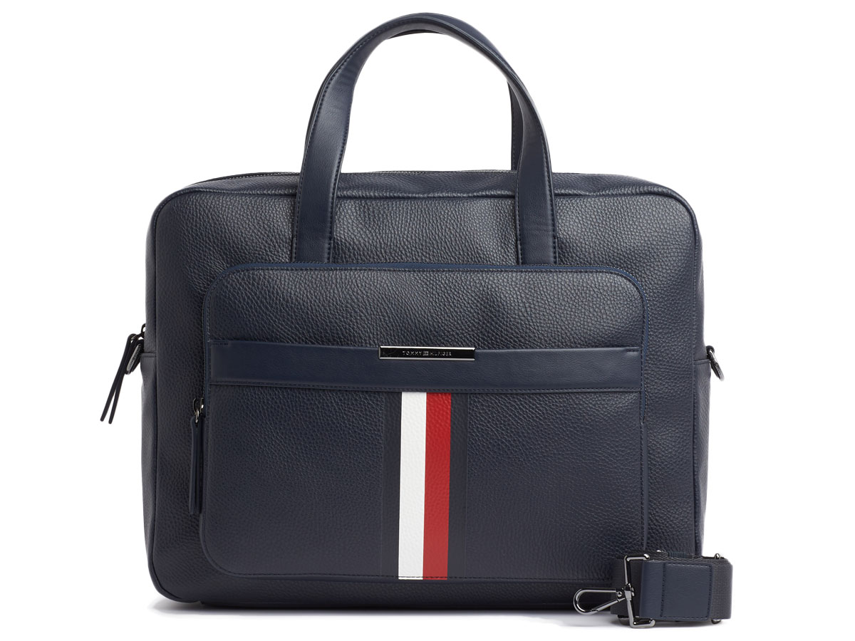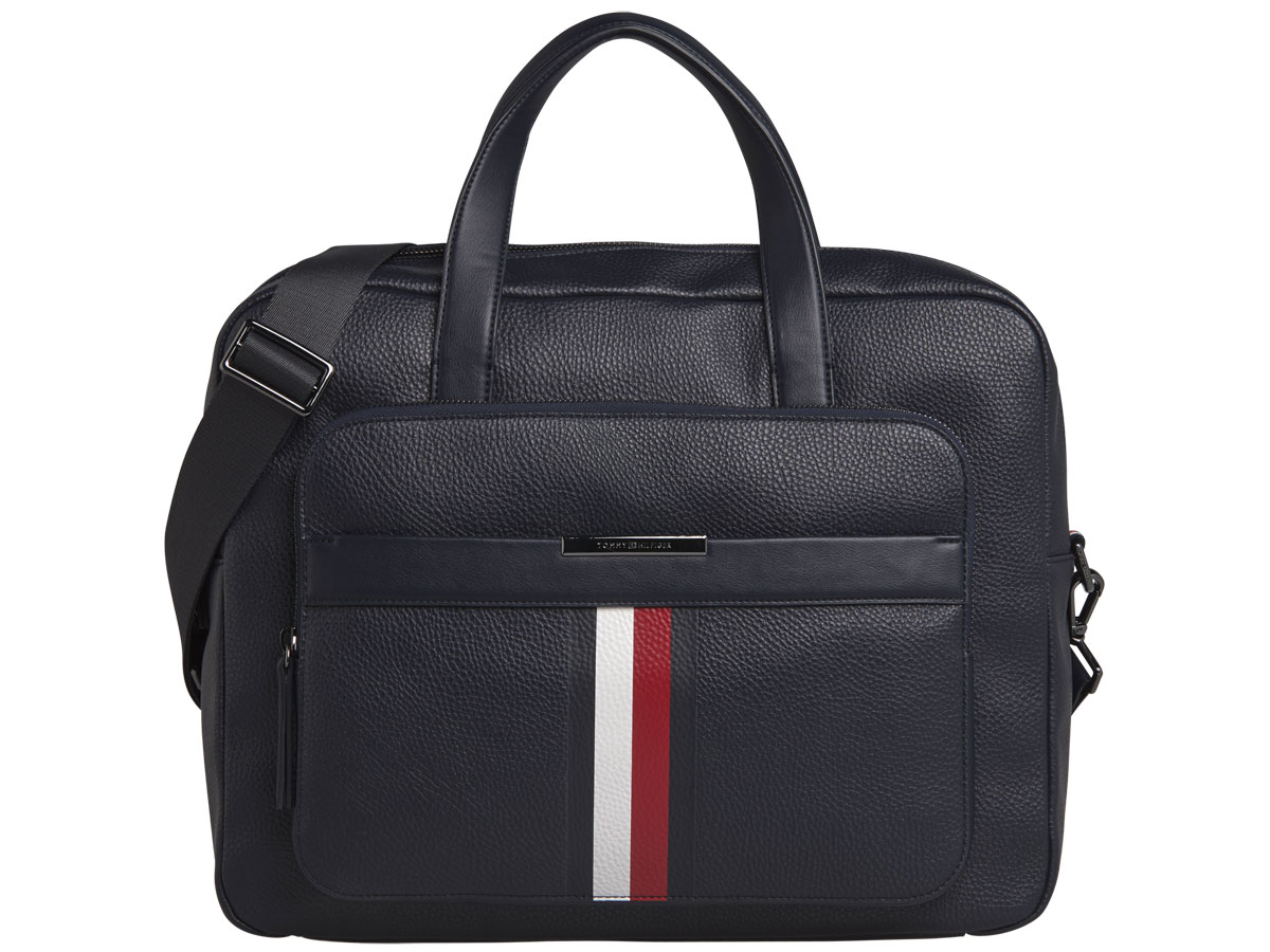 Deze stijlvolle Tommy Hilfiger laptoptas geeft een subtiele twist aan uw work outfit dankzij de Sky Captain uitvoering waarbij chique donkerblauw is gecombineerd met rood-witte band centraal over de tas. Ook in de voering van de tas komt dit gestreepte patroon terug!