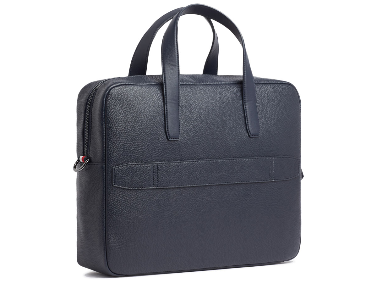De Tommy Hilfiger laptoptas beschikt over dubbele handvatten, maar komt ook met een afneembare en verstelbare schouderband. Achterop de tas vindt u een trolley band, waarmee het mogelijk is de tas over het handvat van een reistrolley te schuiven.