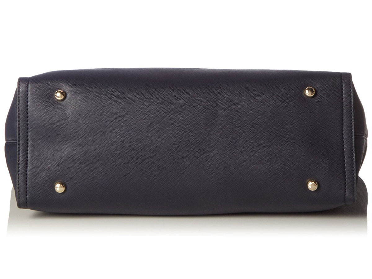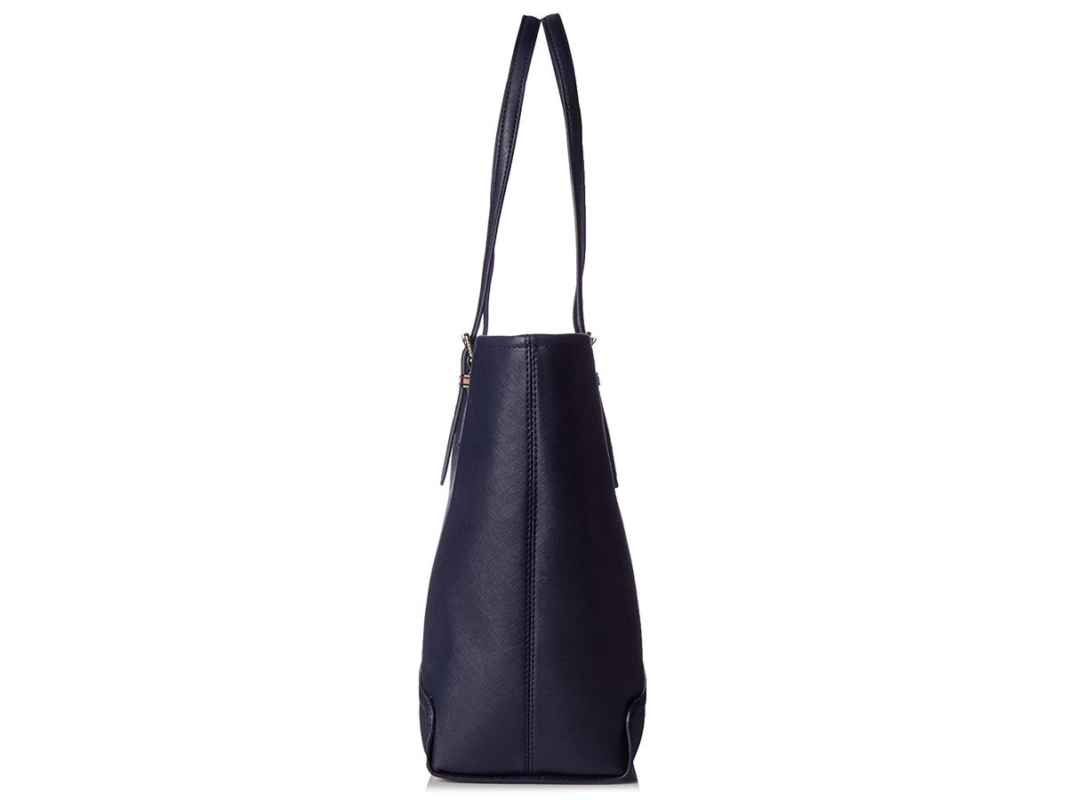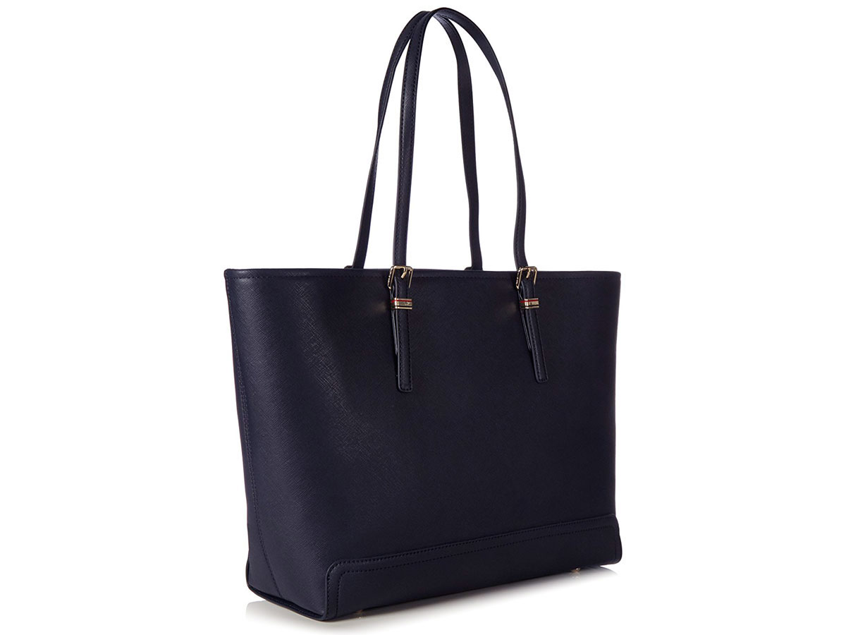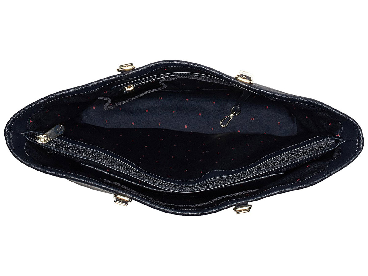De laptoptas is gemaakt van donkerblauw Saffiano leder en heeft een voor Tommy Hilfiger kenmerkende donkerblauwe voering. Centraal in de laptoptote zit het laptopvak dat met een ritss afsluitbaar is. Aan beide zijden van dit centrale vak is veel ruimte, een ritsvakje en meerdere kleine organiser vakjes.